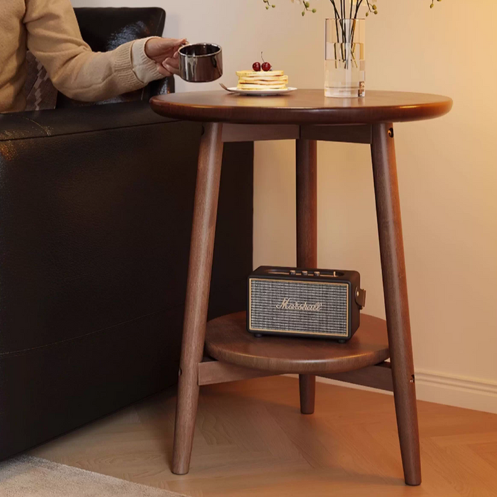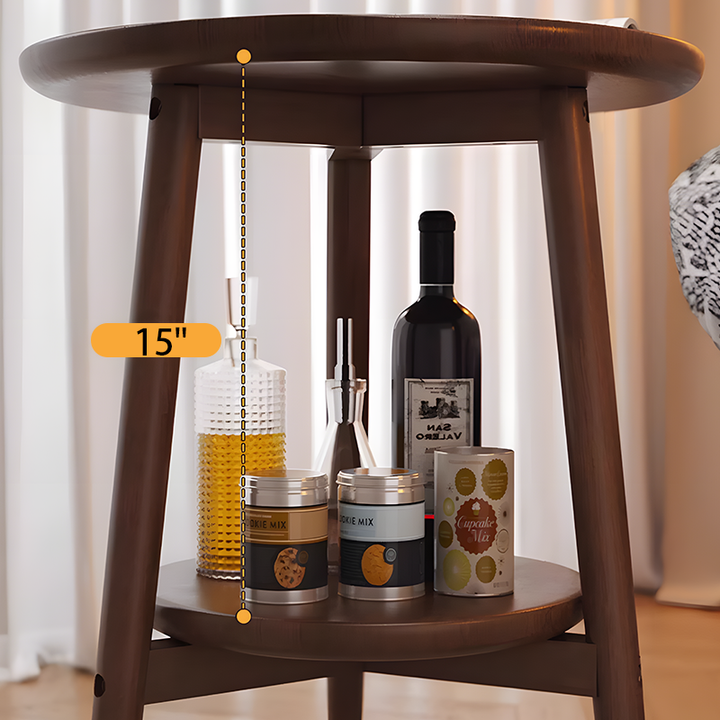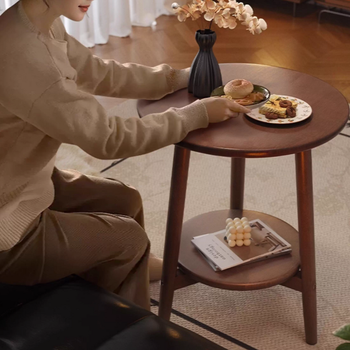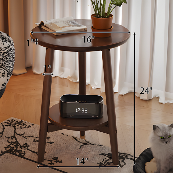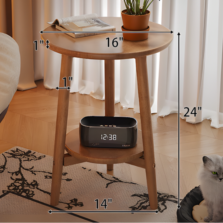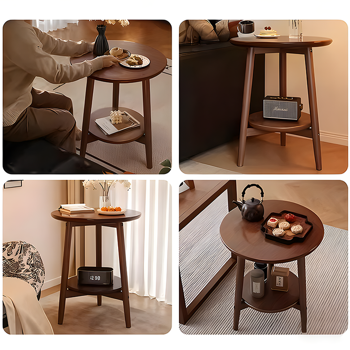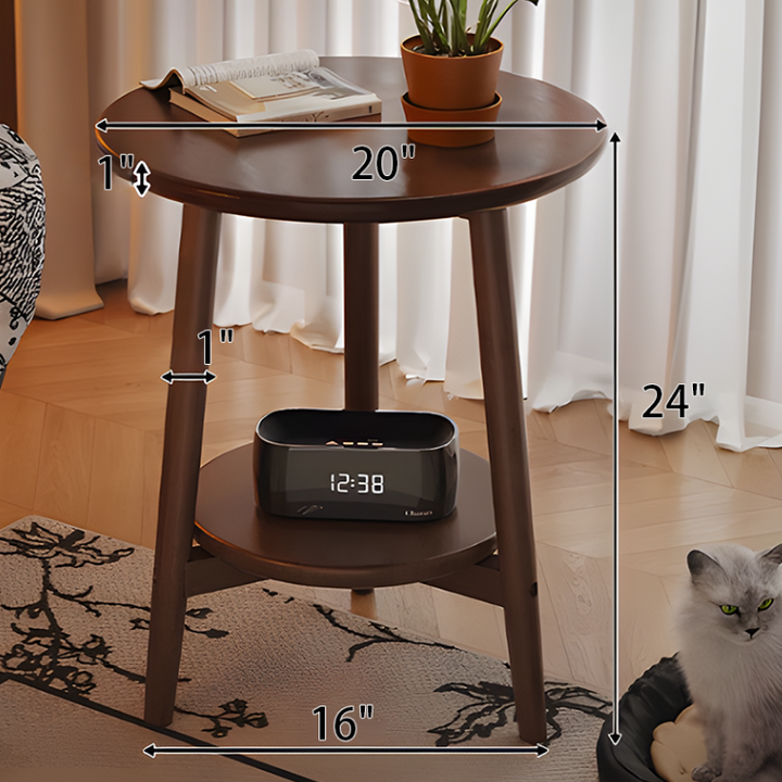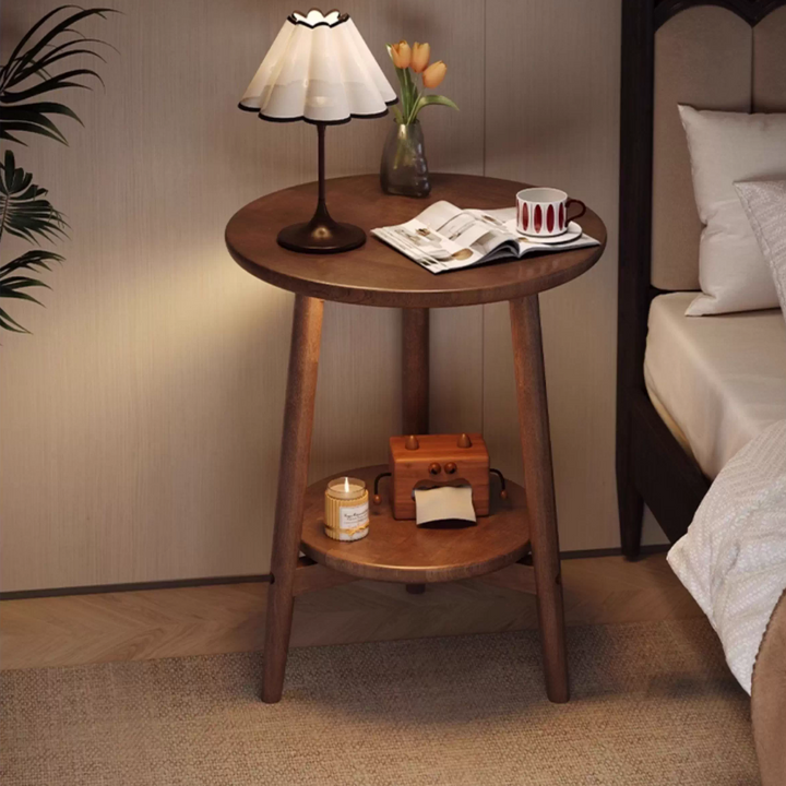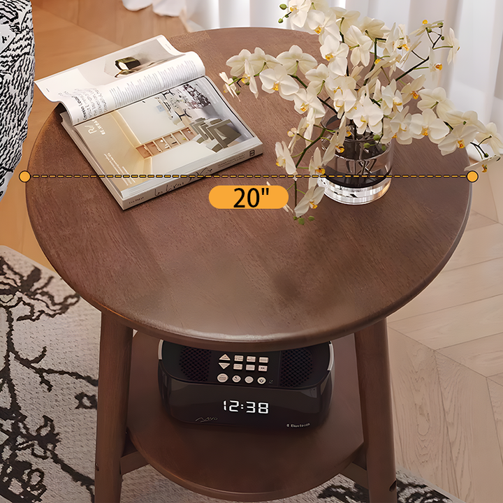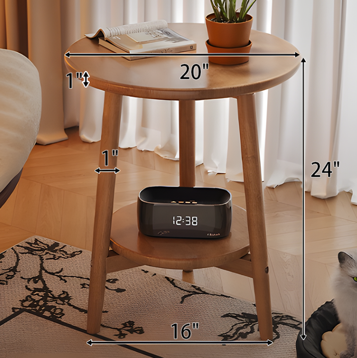 Solid Wood Round Side Table, Living Room Table, Multifunctional Nightstand, Double-Tier Storage Table