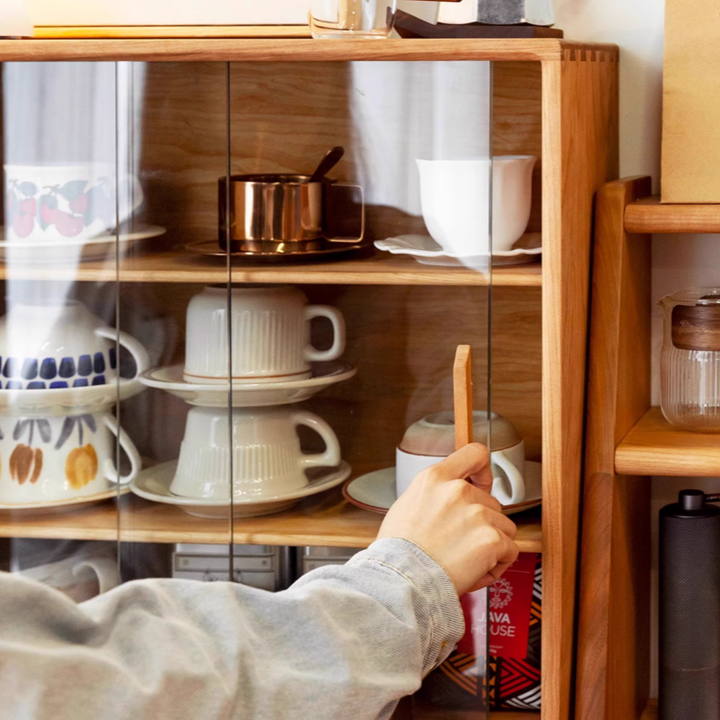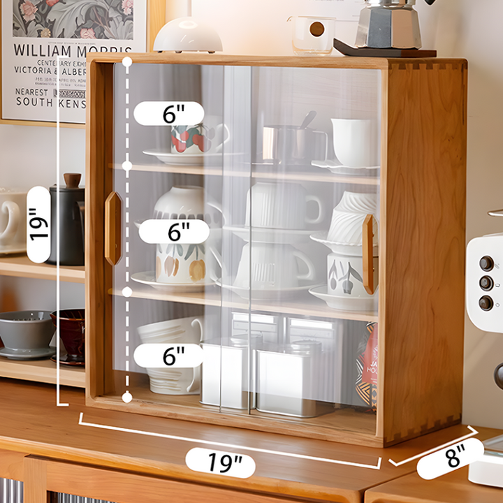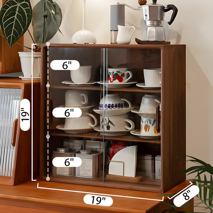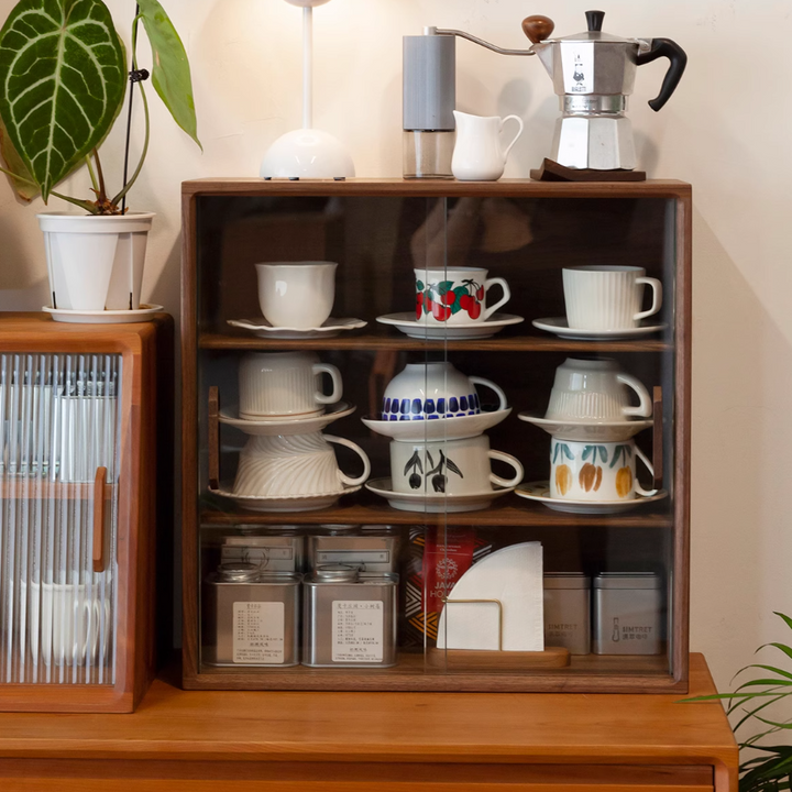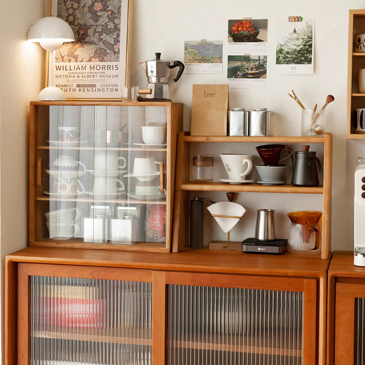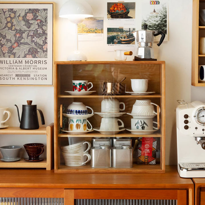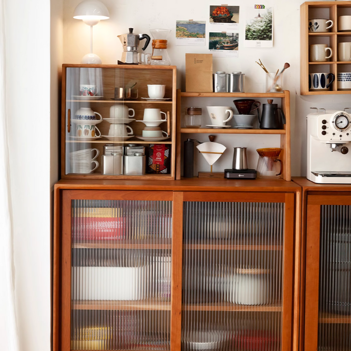 Solid Wood Storage Cabinet, Glass Door Cabinet, Coffee Cup Display, Kitchen Storage Rack, Double-Tier Storage Shelf