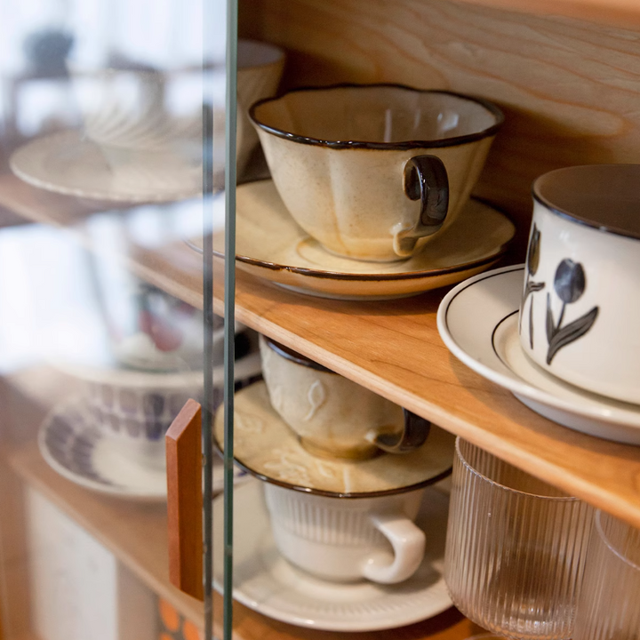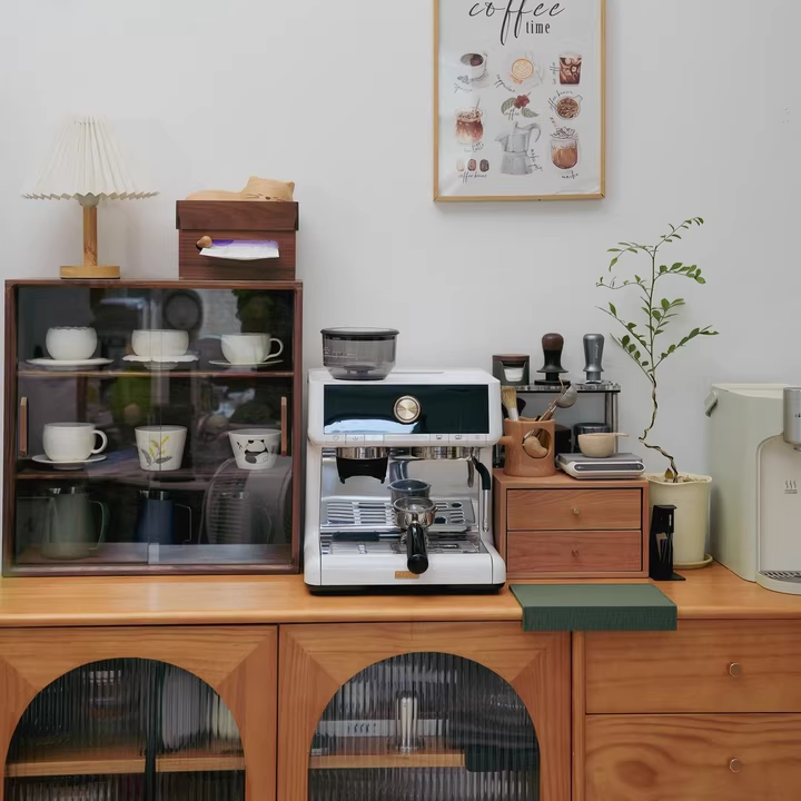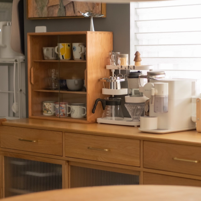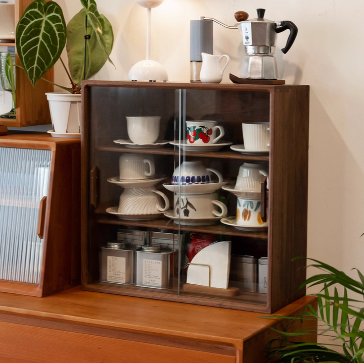 This solid wood storage cabinet with a glass door offers excellent display functionality. The two-tier structure provides ample storage space, ideal for storing coffee cups, tableware, and other items. Its compact size saves space while being both practical and aesthetically pleasing, making it suitable for kitchens or dining rooms.