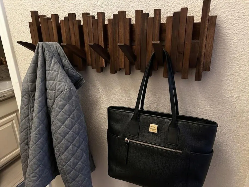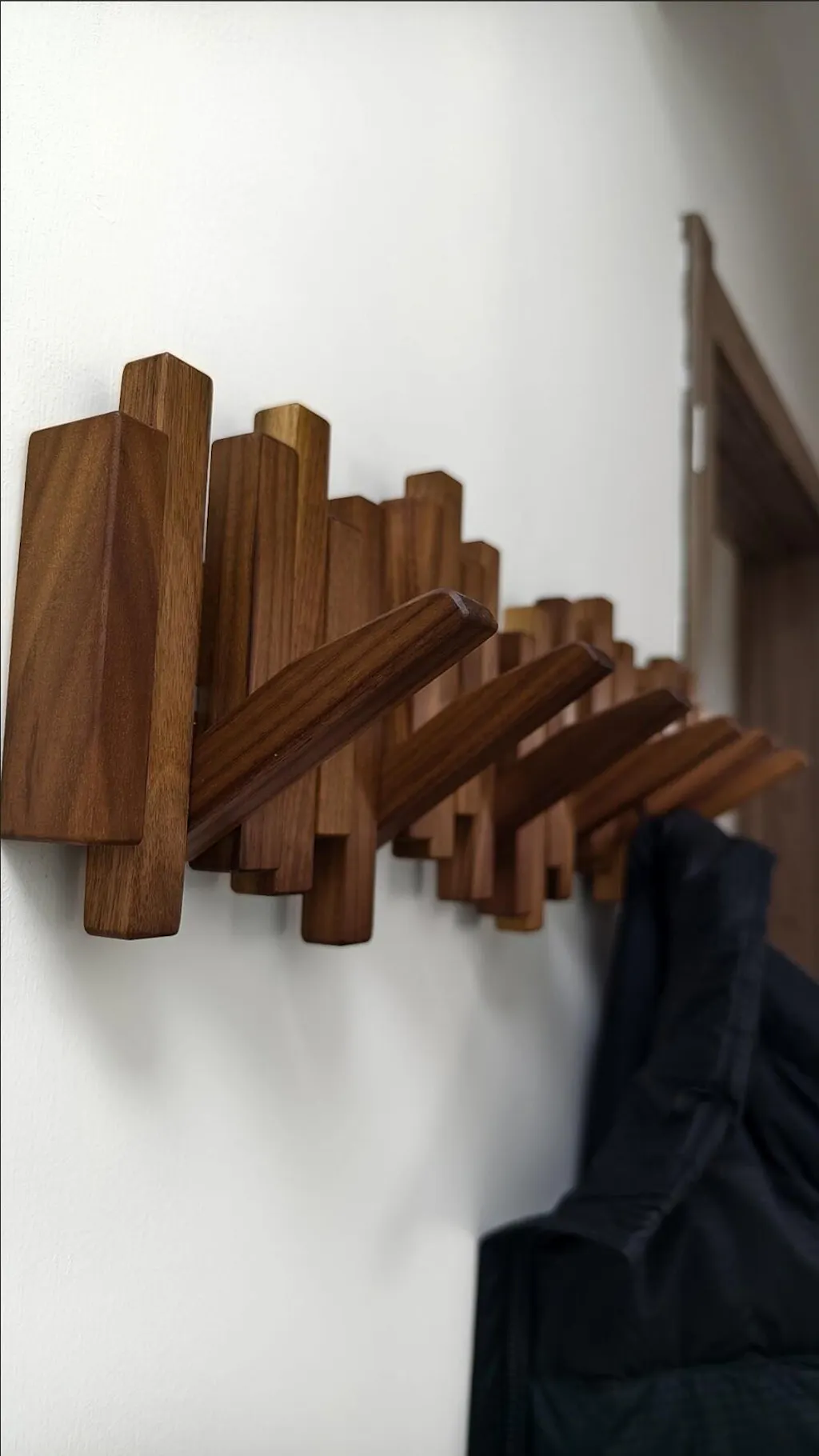 When not in use, the hooks can be fully retracted and hung on the wall, blending seamlessly with the surrounding space, much like a piece of art. Once the hooks are flipped down, it transforms into a practical storage unit. Arrange multiple wooden coat racks in the hallway or at the entrance of the living room to create an interesting focal point.