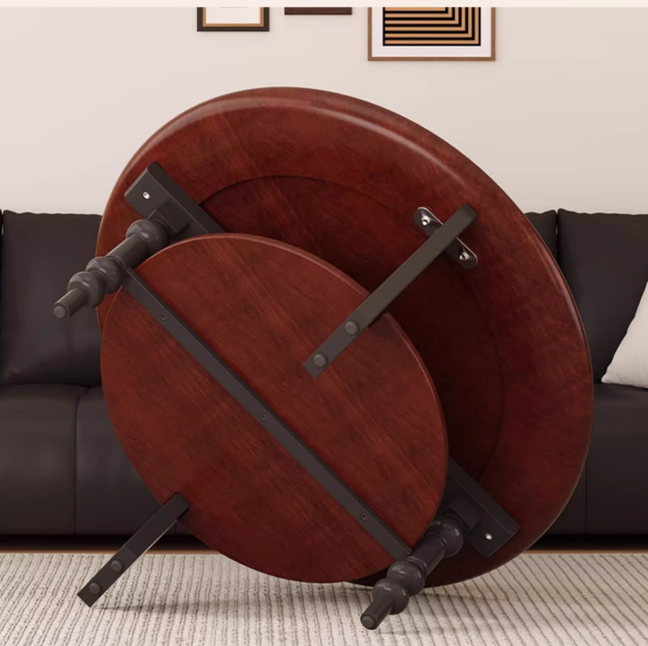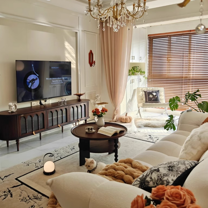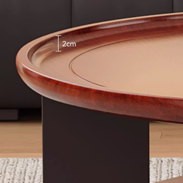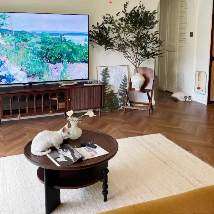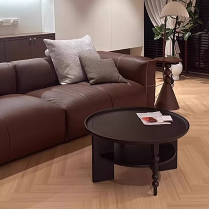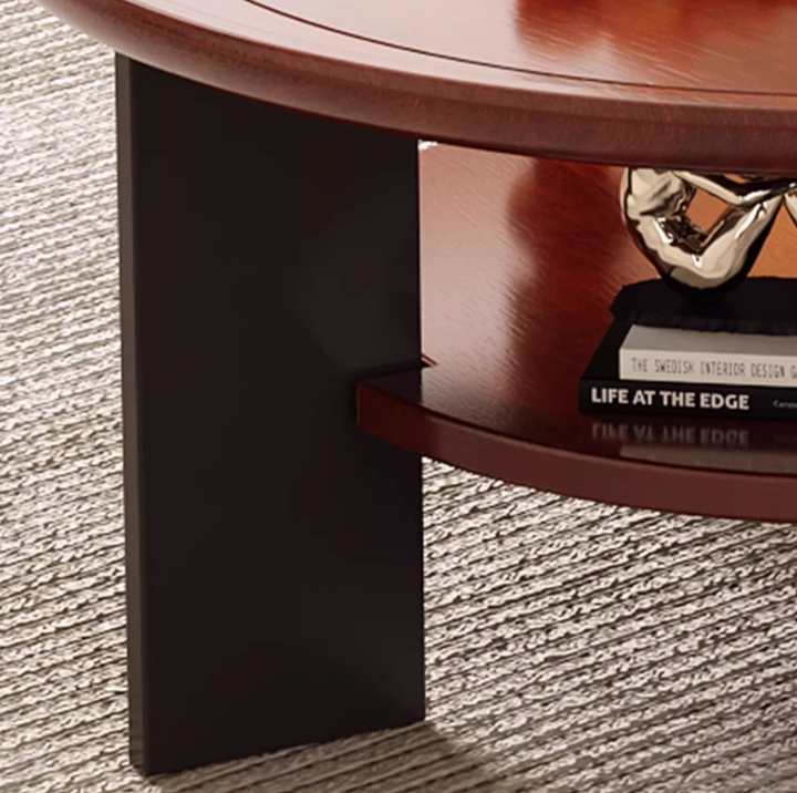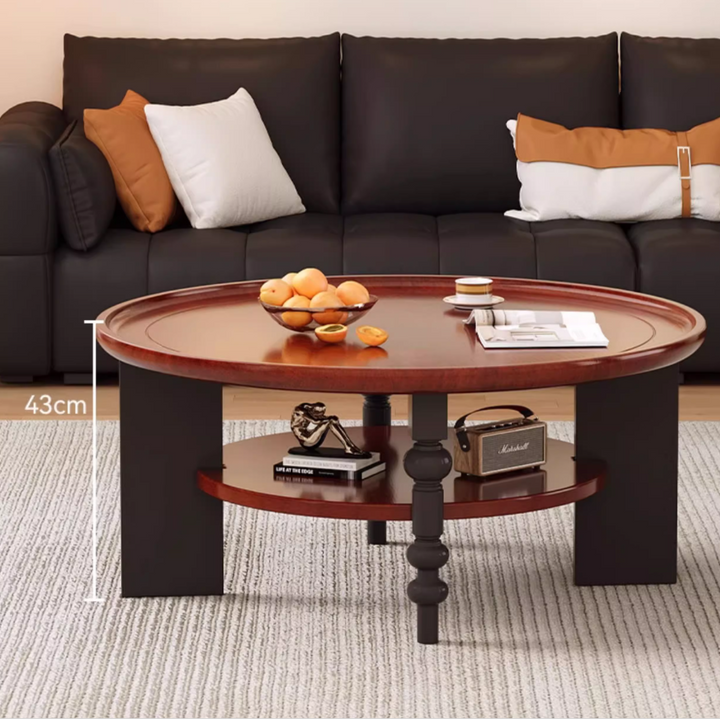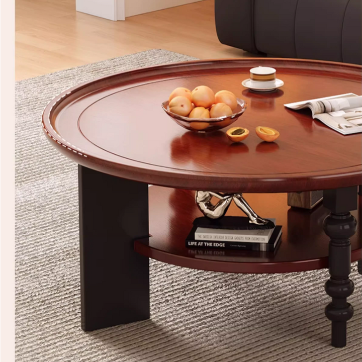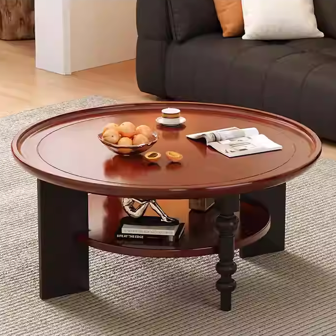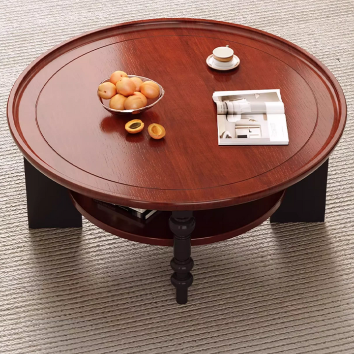This round solid wood coffee table features a double-layer design that combines aesthetics with practicality. The spacious upper surface accommodates tea sets and magazines, while the lower storage compartment holds books or decorative items, maximizing space utilization.