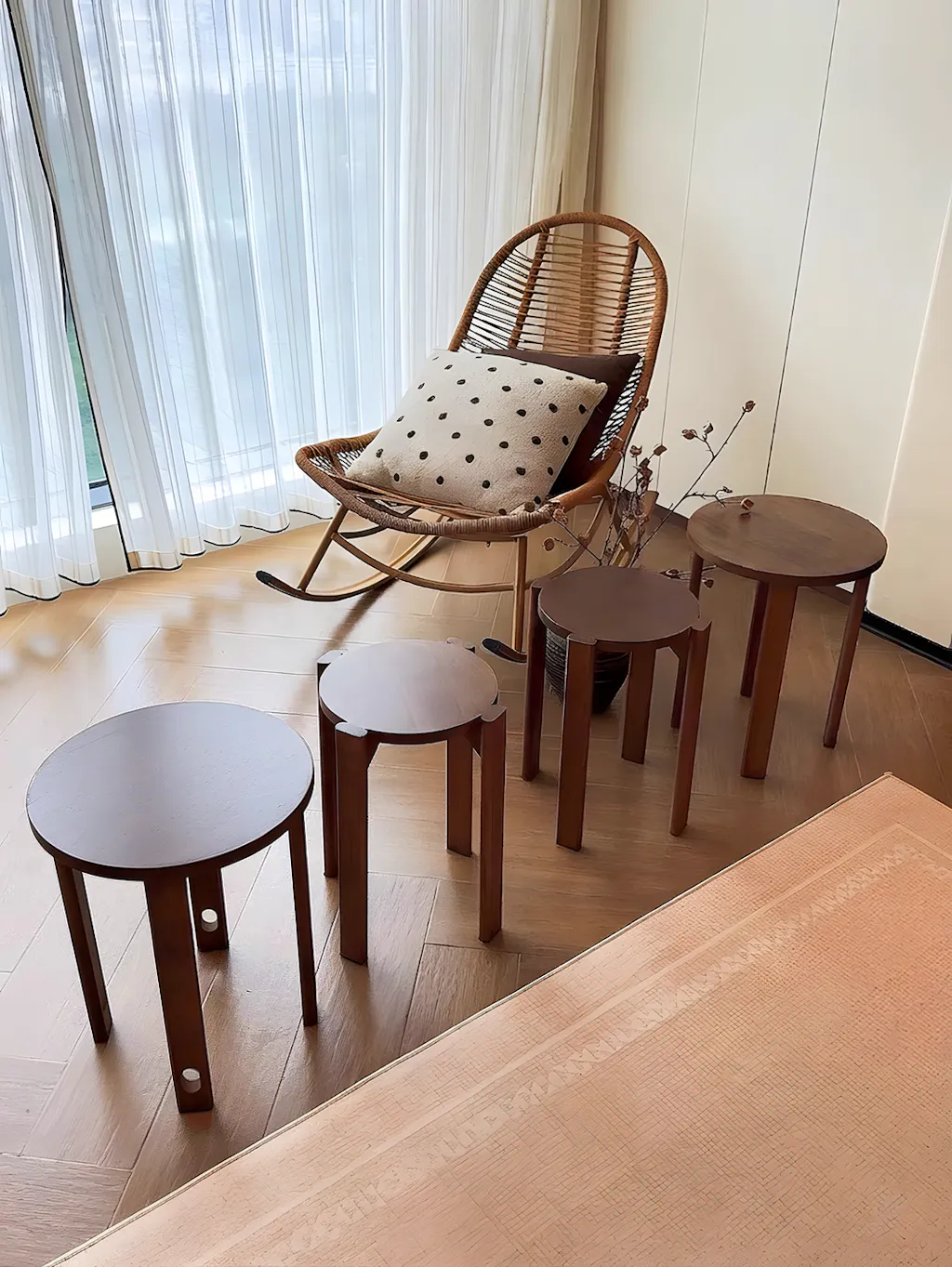 It is a side table that transforms into four stools, designed for apartment dwellers who like to host. It is a practical product, multi-functional and space-saving, with a clean and modern aesthetic. Can be combined/detached for use, light and compact, flexible and adaptable to multiple scenes. The overall shape is round, smooth and finely polished, without burrs. The thick stool surface and thickened four legs support strong load-bearing capacity.