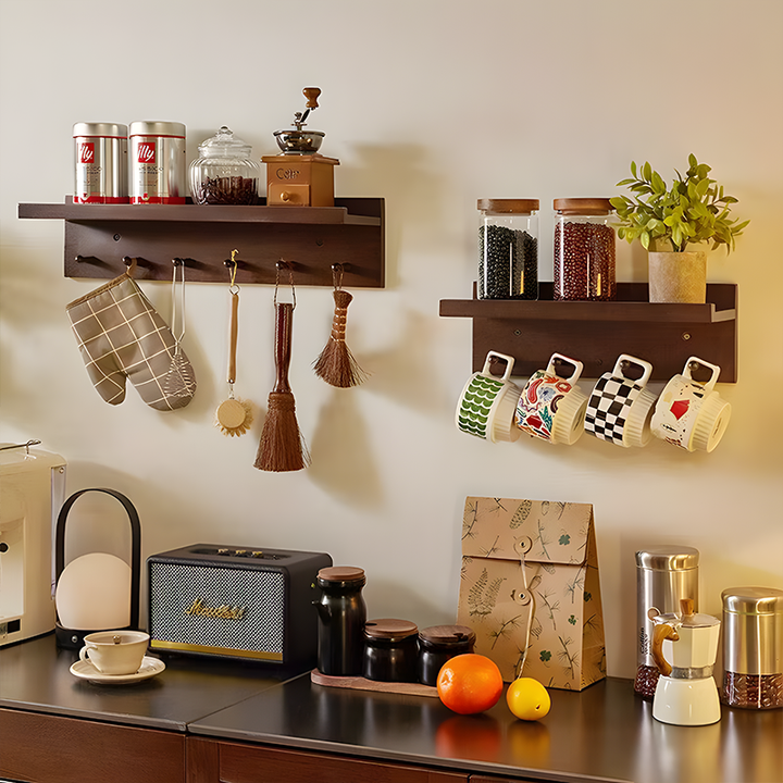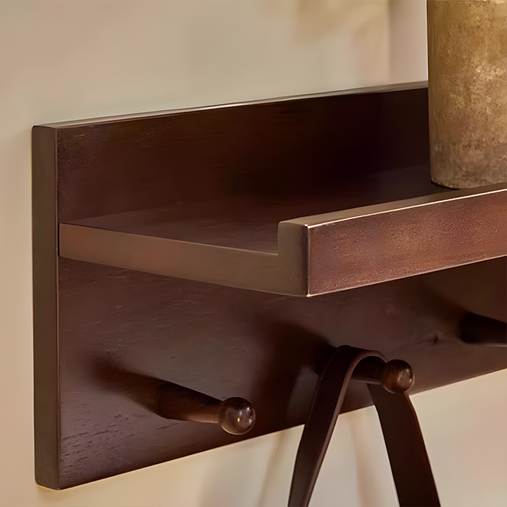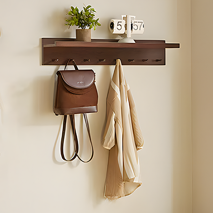 Handcrafted Solid Wood Floating Shelf with Hooks – Walnut & Cherry Wood | No-Drill or Screw Mount