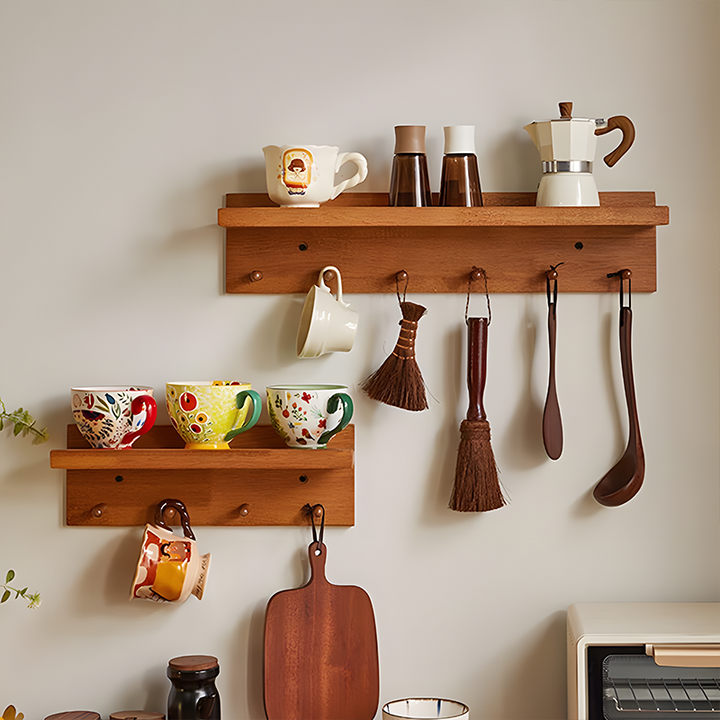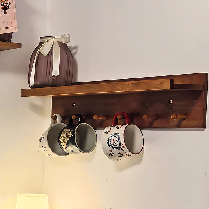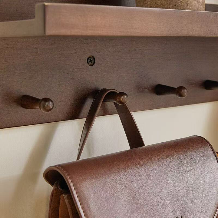Smart Design: Floating shelf with safety guard rail & rounded wooden hooks