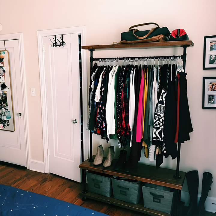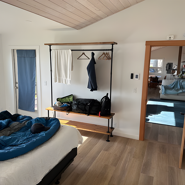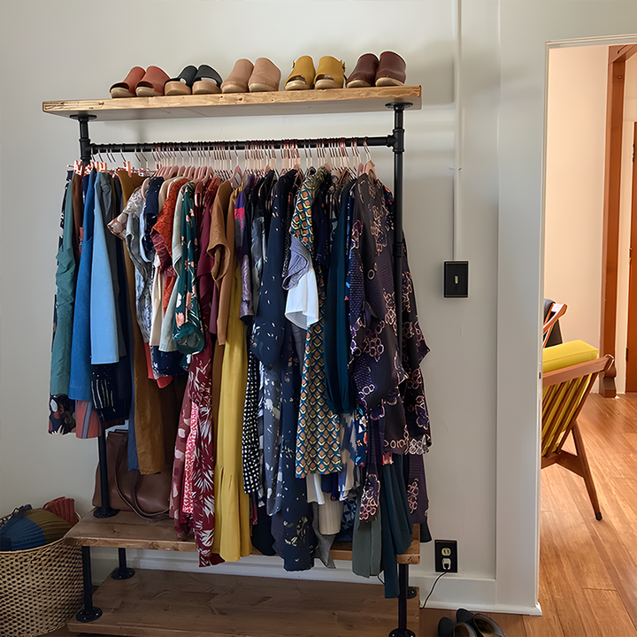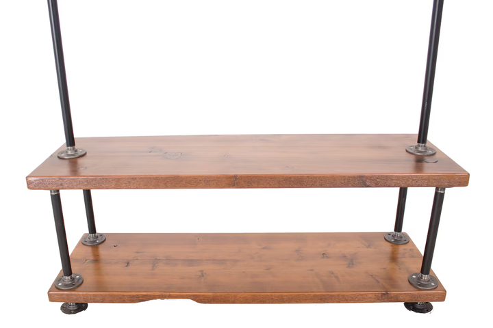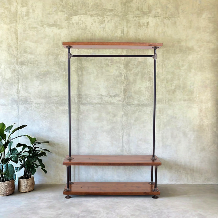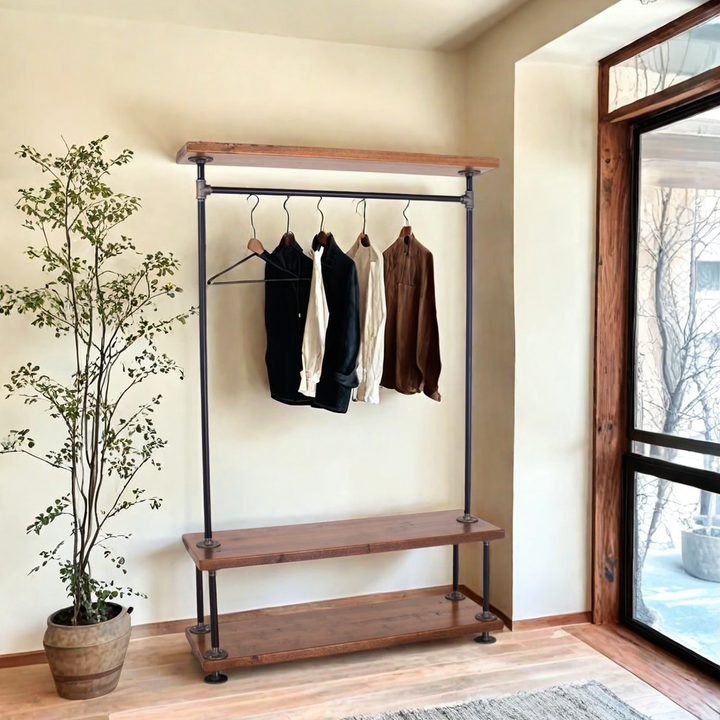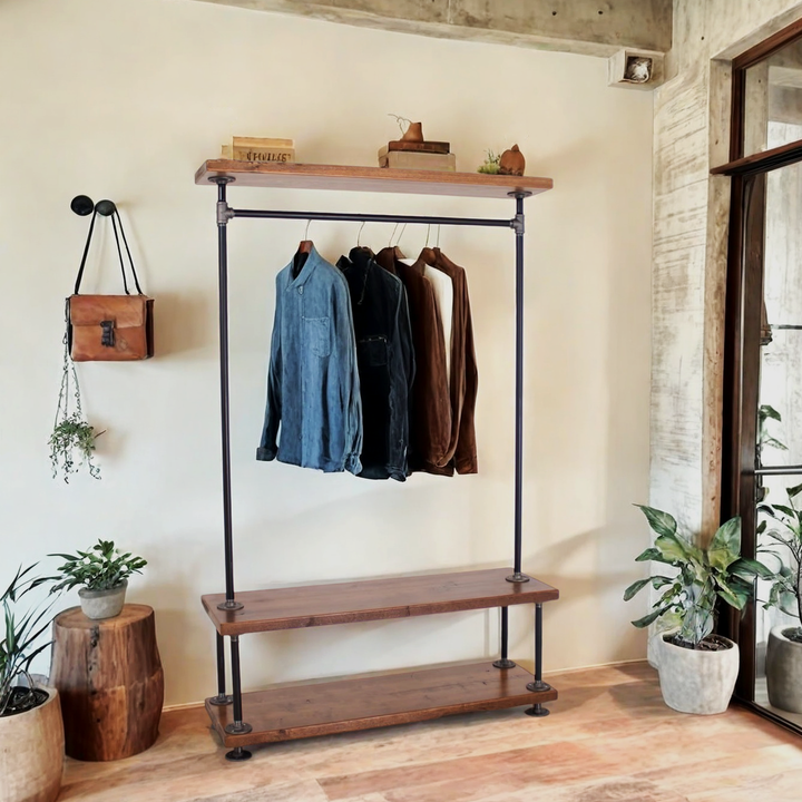 Organize your wardrobe in style with this handcrafted industrial clothing rack, featuring warm solid wood shelves and a sturdy black steel frame. Perfect for bedrooms, studios, living rooms, or retail spaces—maximizing storage while keeping everything within easy reach.