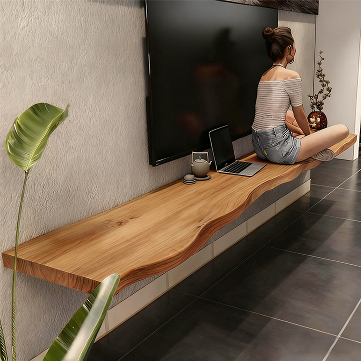 This wall-mounted floating table is crafted from high-quality solid wood, cut directly from logs, retaining naturally smooth edges for a lively feel. Each table is meticulously sanded and finished with a natural finish for a refined and durable feel. Securely attached to the wall, it features a steel bracket and can support up to 500 pounds. Designed for both practicality and aesthetics, it can be customized to any size and feature drawers for added storage, perfect for a home office or studio. Easy to install, it's stable and durable. This isn't just a table; it's the result of our meticulous craftsmanship, right in your home.