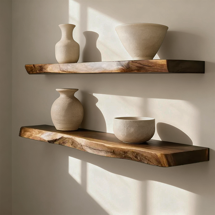 Single Slab: Each shelf is crafted from a single slab, highlighting uniform grain and rich, natural color.