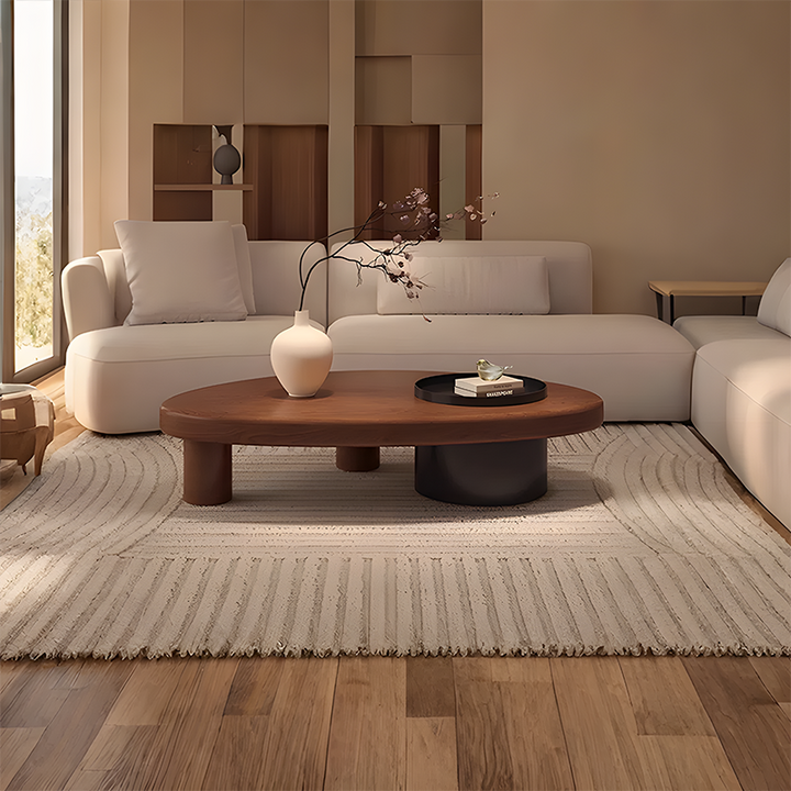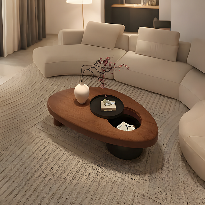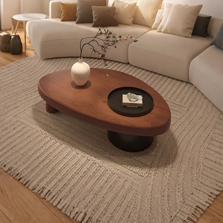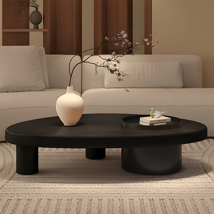 A solid wood coffee table with a smooth oval top, sturdy legs, and a bold black metal barrel. A timeless blend of wood and metal that fits seamlessly in both modern apartments and spacious homes.