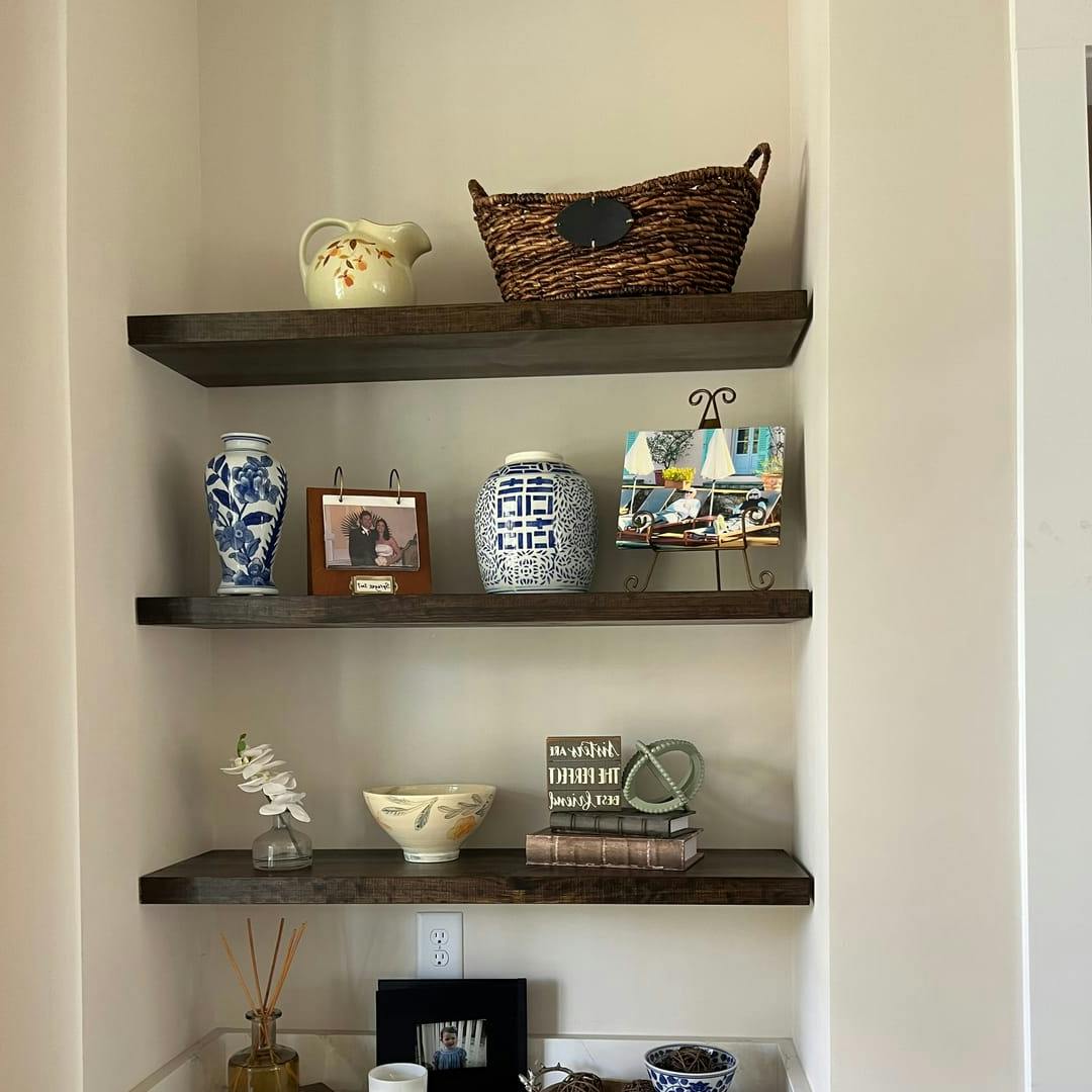 Handcrafted in our home workshop, these floating shelves are made from around 6-10 year-old natural wood, each one carefully crafted to showcase the rich grain and character. With their sturdy construction and hidden bracket, these shelves are rugged yet refined—perfect for adding country charm to any room.