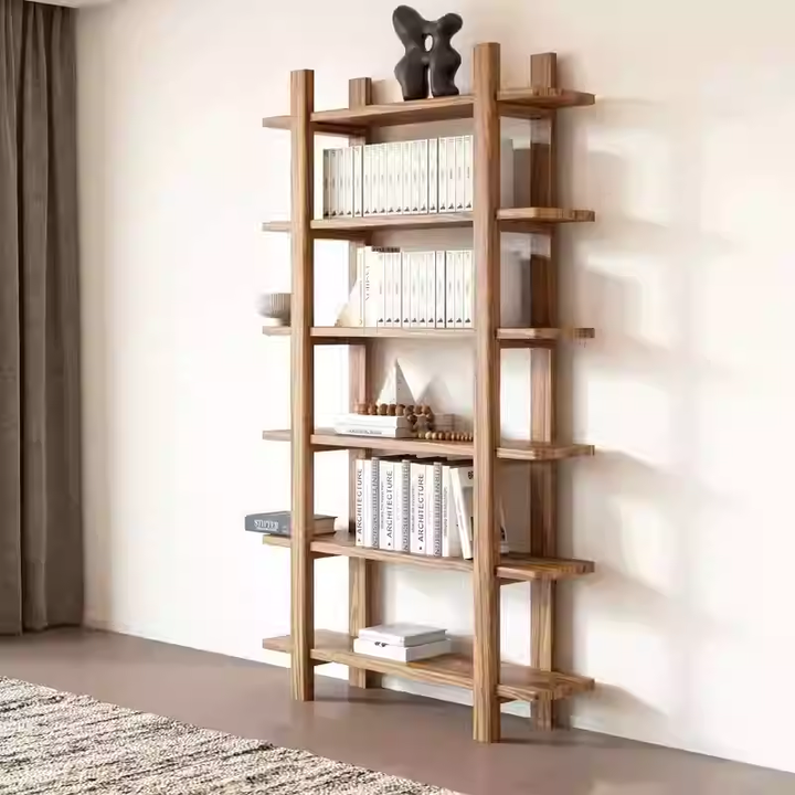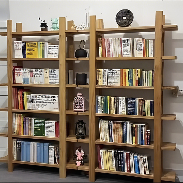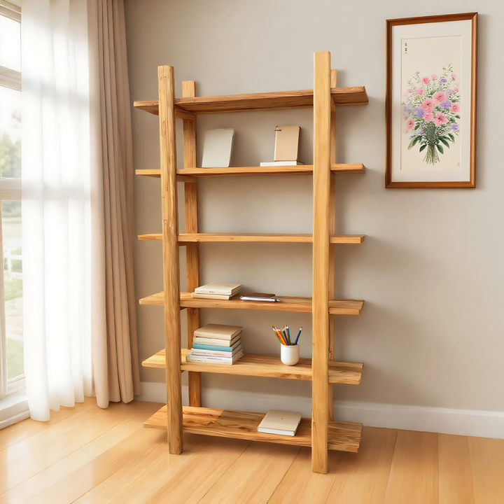 This wooden bookshelf features a sleek, contemporary design with an open, multi-tiered structure for convenient storage of books and decorative items. Crafted from solid wood for durability, its natural grain showcases rustic beauty. Ample storage space accommodates diverse needs, while its natural color complements any home decor, making it an ideal choice for living rooms or studies—combining practicality with aesthetic appeal.
