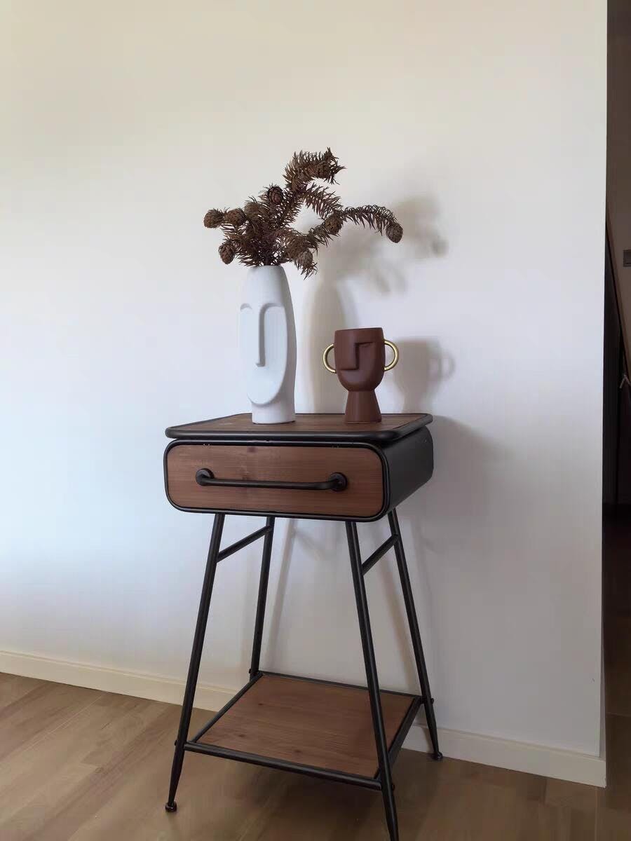 Retro Side Table with Drawer & Shelf Wooden top Metal Legs