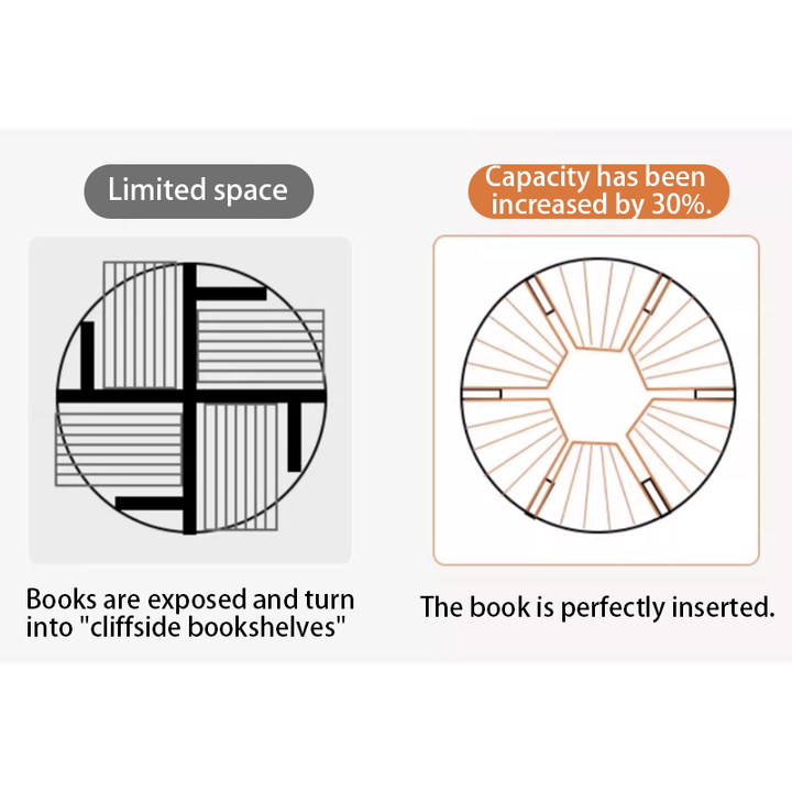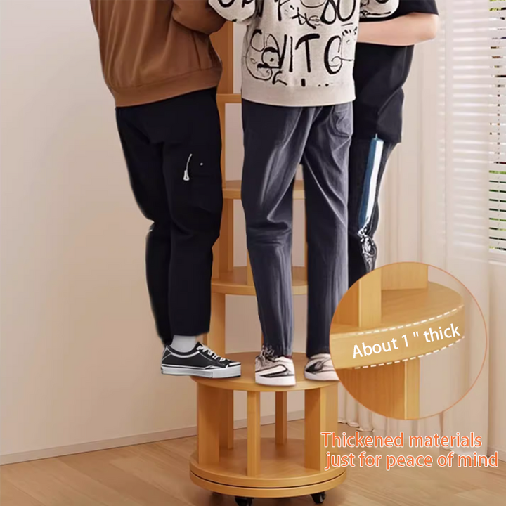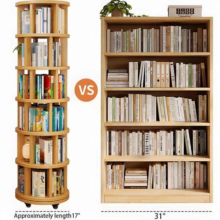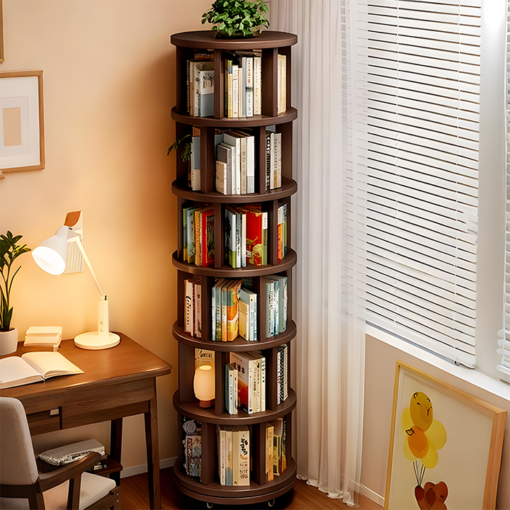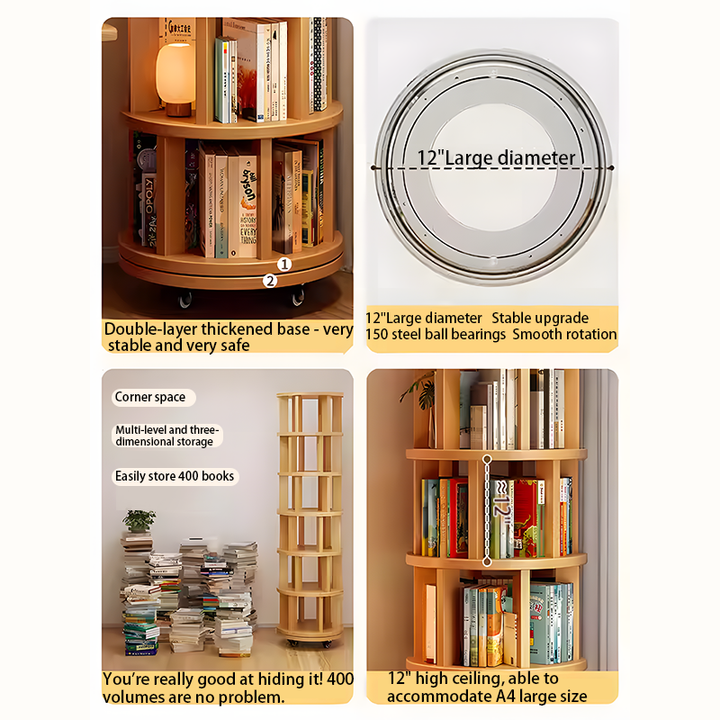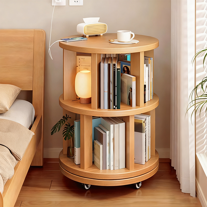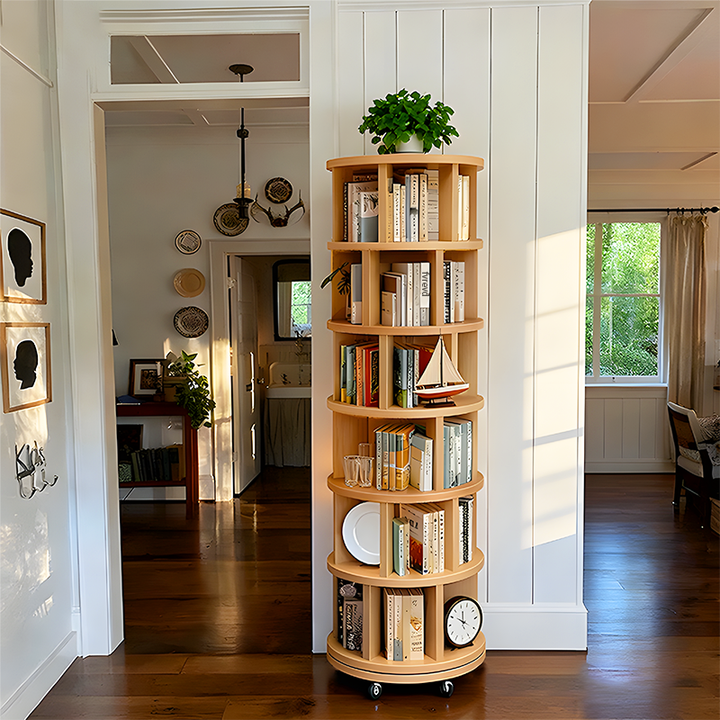This circular rotating bookshelf is crafted from pine wood for sturdy and durable construction. Its multi-tiered open design effortlessly displays and stores books, documents, decorative items, and green plants. With 360° free rotation, it offers convenient access without taking up space, making it ideal for living rooms, studies, children's rooms, and more.