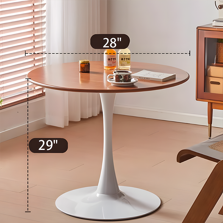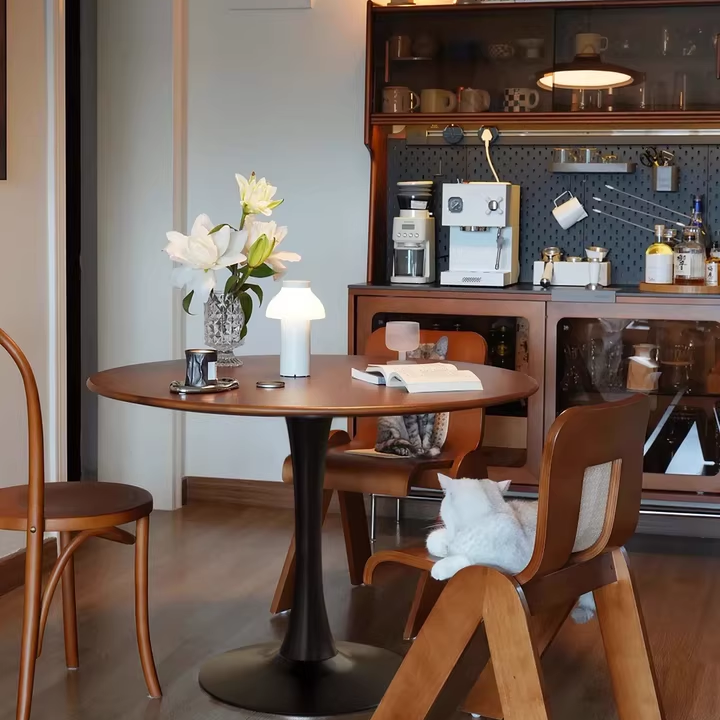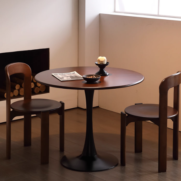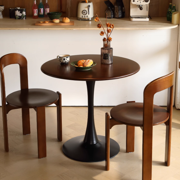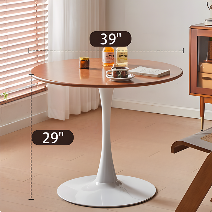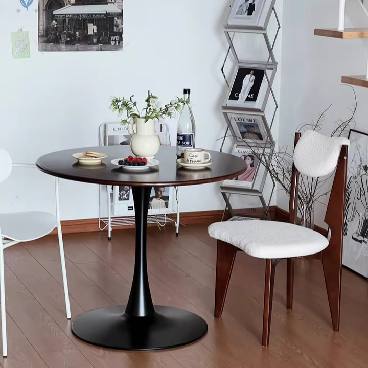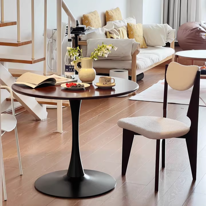This round dining table features a solid wood tabletop paired with a metal base, showcasing modern simplicity and sturdy quality. Its rounded shape saves space, making it ideal for compact homes, dining areas, or coffee corners—perfect for daily meals, afternoon tea, or cozy gatherings.