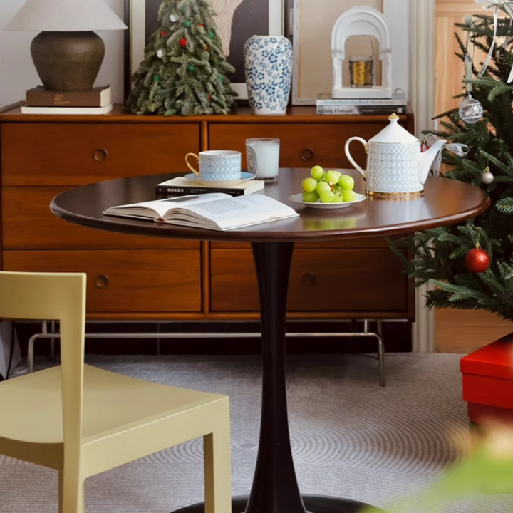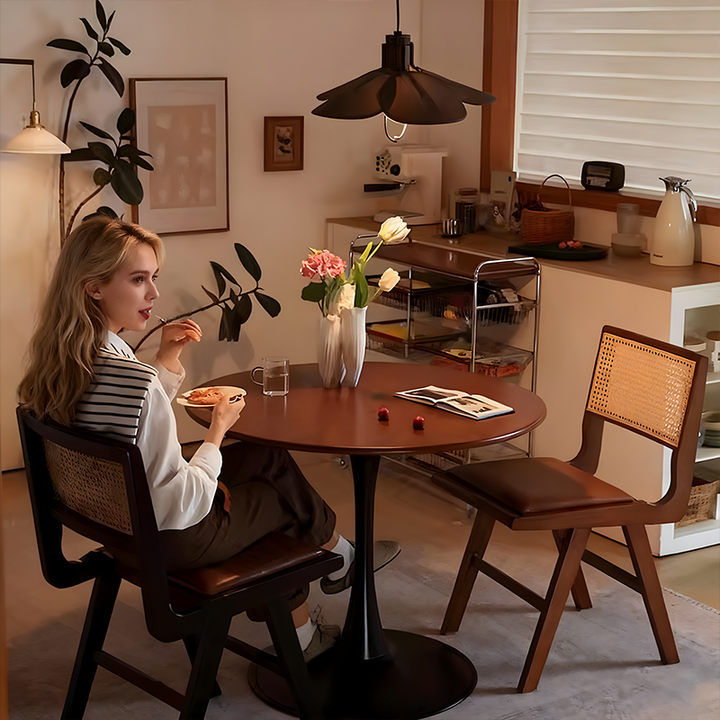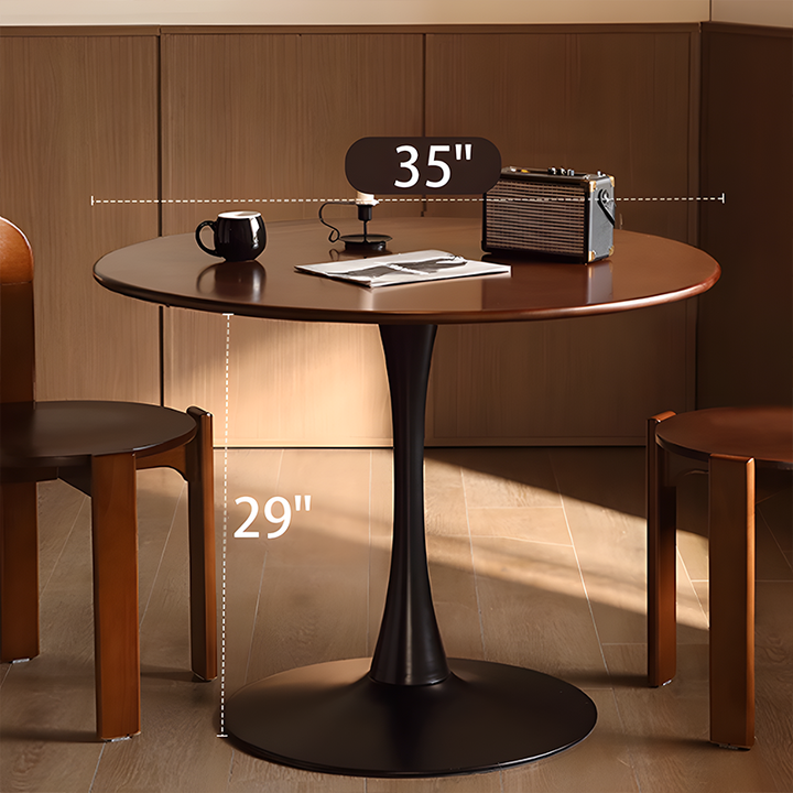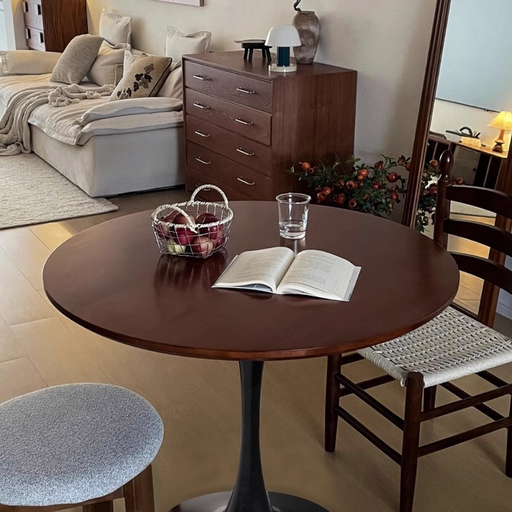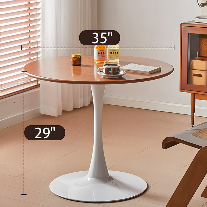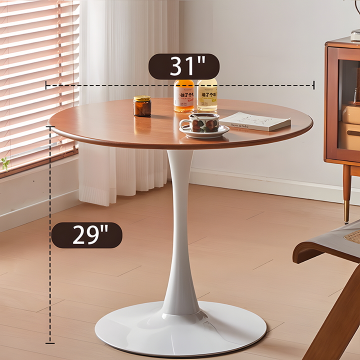 This round dining table features a solid wood tabletop paired with a metal base, showcasing modern simplicity and sturdy quality. Its rounded shape saves space, making it ideal for compact homes, dining areas, or coffee corners—perfect for daily meals, afternoon tea, or cozy gatherings.