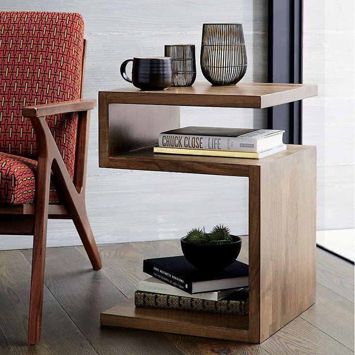 A clever squared "S" of solid oak shapes a design open to possibilities. Straight up, it's a modern side table with three landings for display and storage. On its side, it's a magazine rack integrated with a tabletop. Exposed box joints at the corners add strength and visual detail. Each side table is unique and may exhibit naturally occurring graining, knots, splitting and mineral deposits that add character to each piece. For a bold, contemporary look pair up as bunching tables.