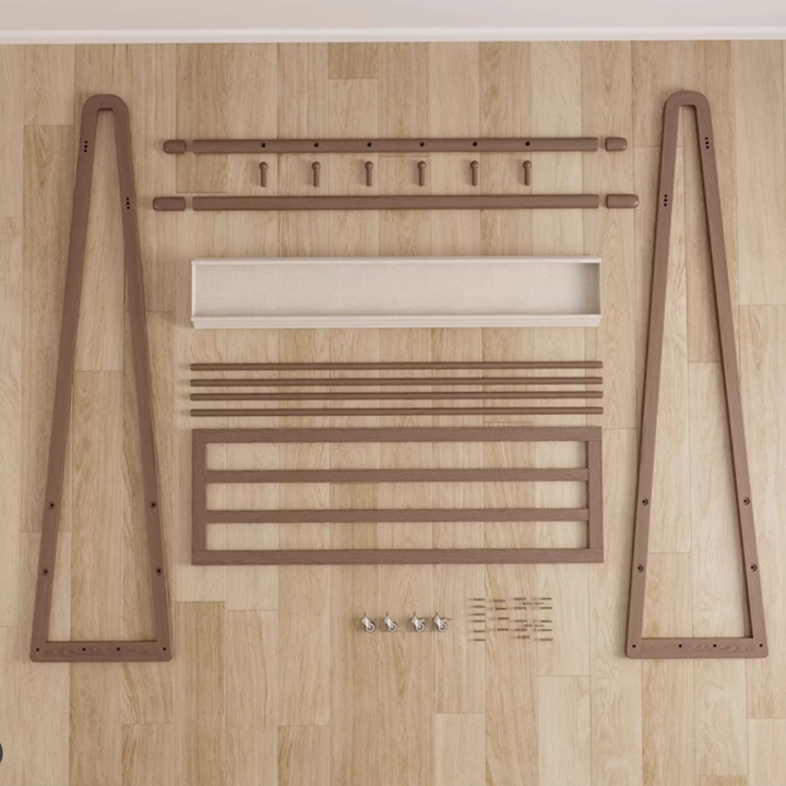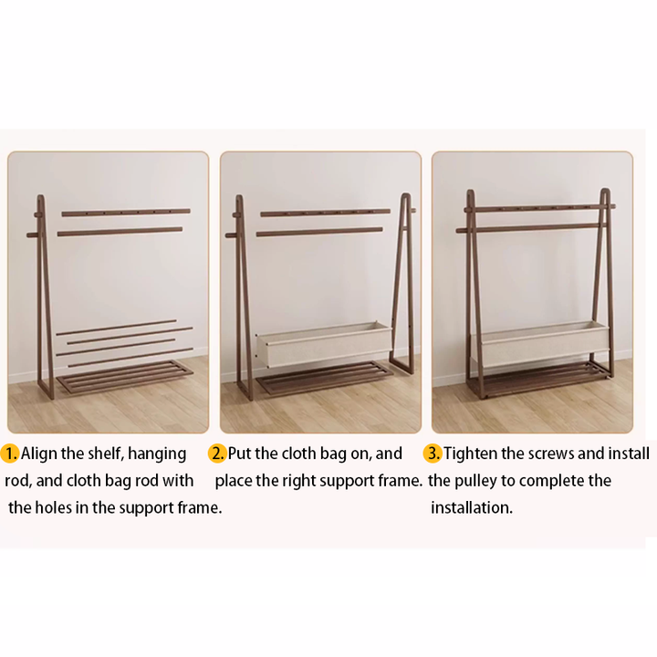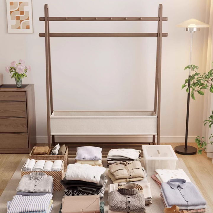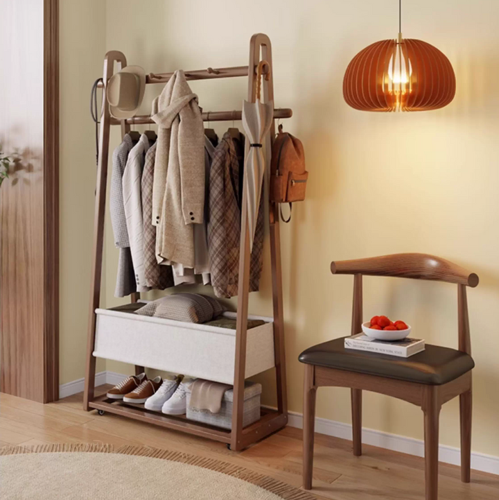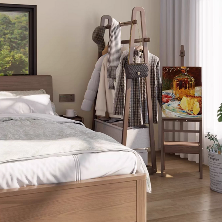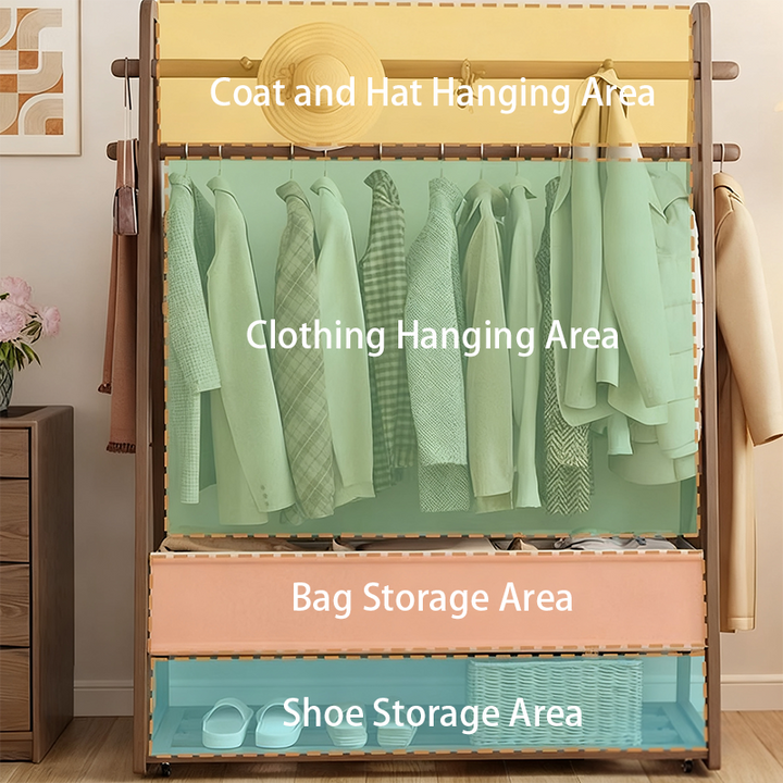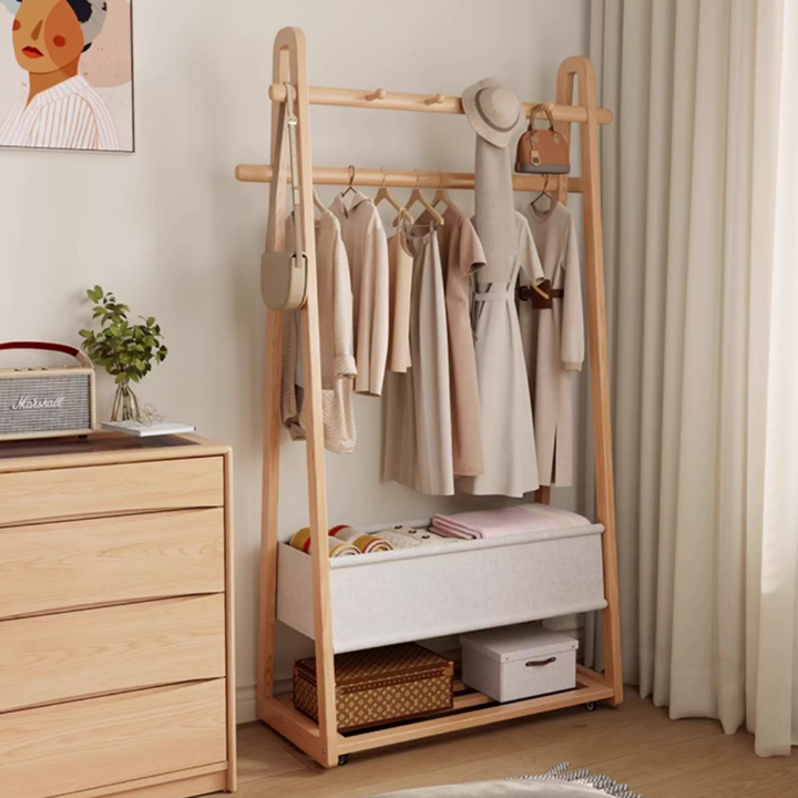 This A-frame solid wood clothes rack is sturdy and durable. Its dual front-and-back hanging design, fabric bag, and bottom storage layer keep clothes neatly organized, easily accommodating hats, shoes, and bags. Lockable swivel casters facilitate easy movement, helping create a tidy and orderly home space.