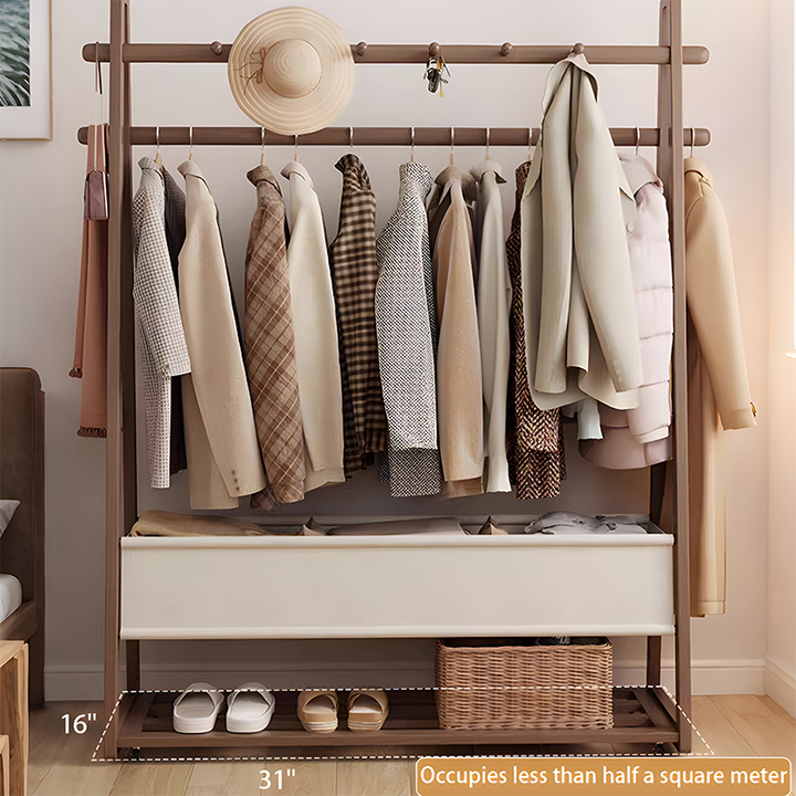 Solid Wood Clothes Rack, Mobile Hanging Rack, Bedroom Clothing Storage Rack, Multi-Tier Clothing & Hat Rack, Storage Rack With Wheels