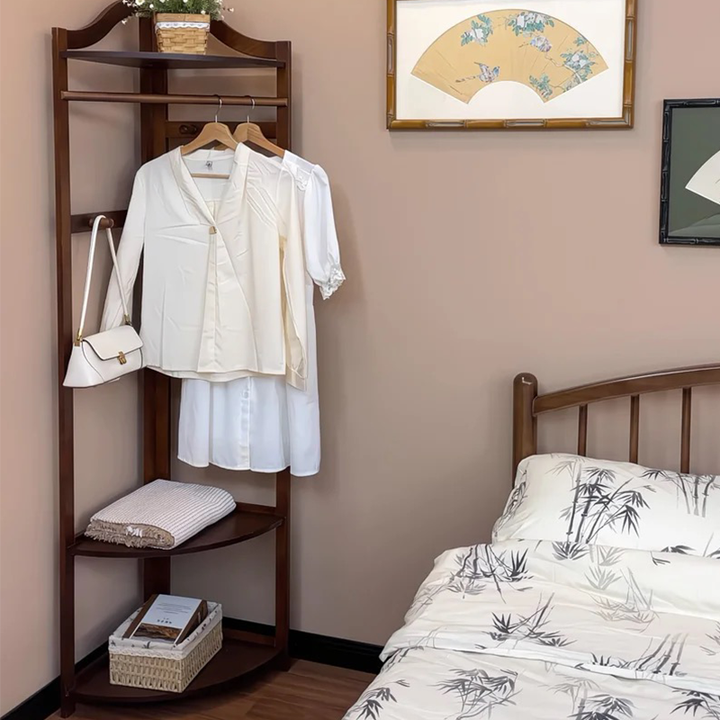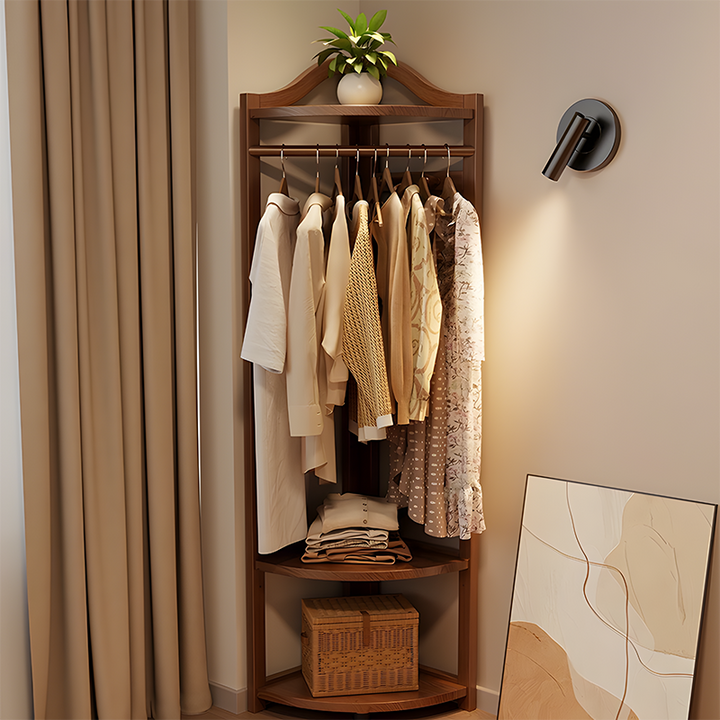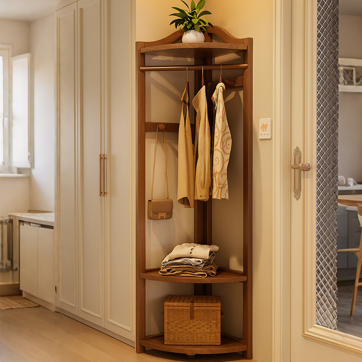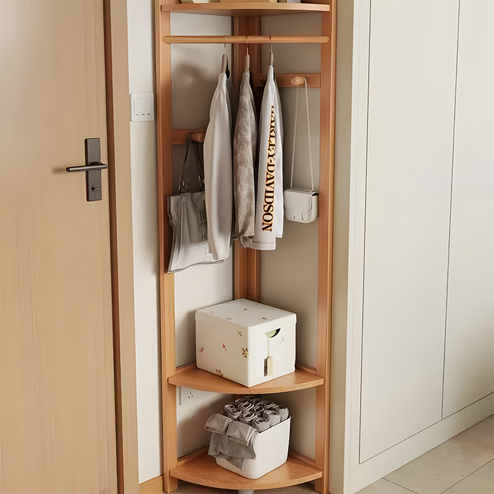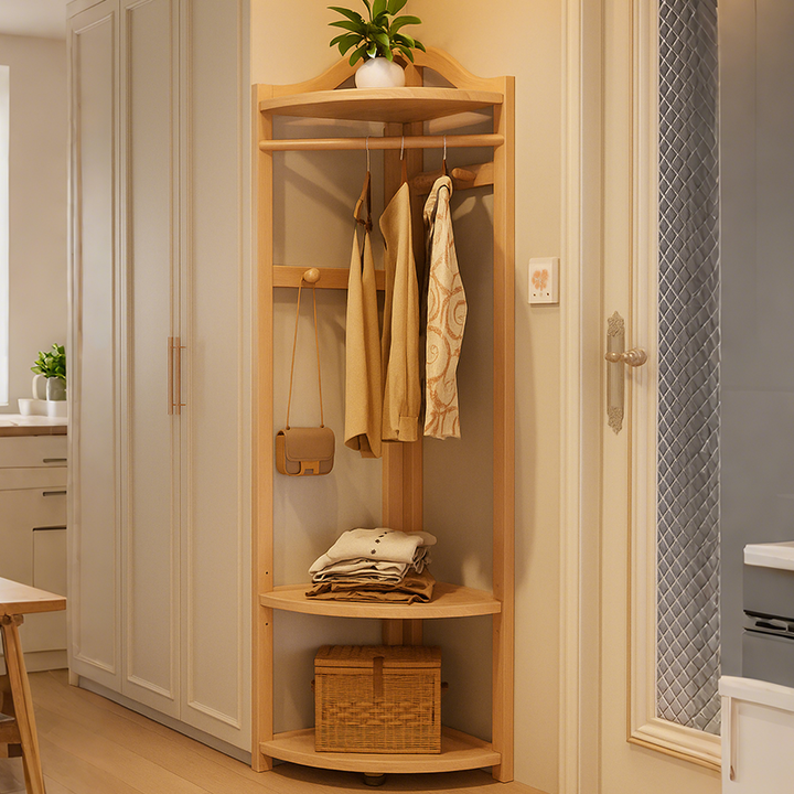 Bring timeless charm and functionality into your home with this solid wood corner coat rack. Designed to maximize unused corner space, it features a sturdy frame with multiple hanging hooks and spacious shelves for shoes, bags, or décor. Perfect for entryways, living rooms, or bedrooms, this organizer combines durability with easy DIY assembly in under 15 minutes.