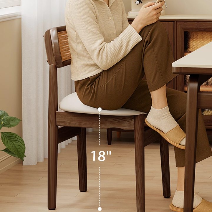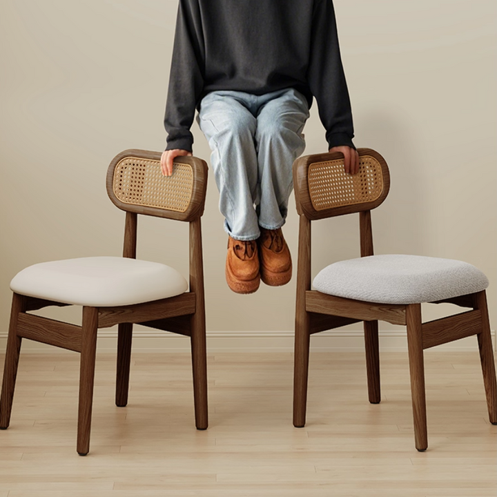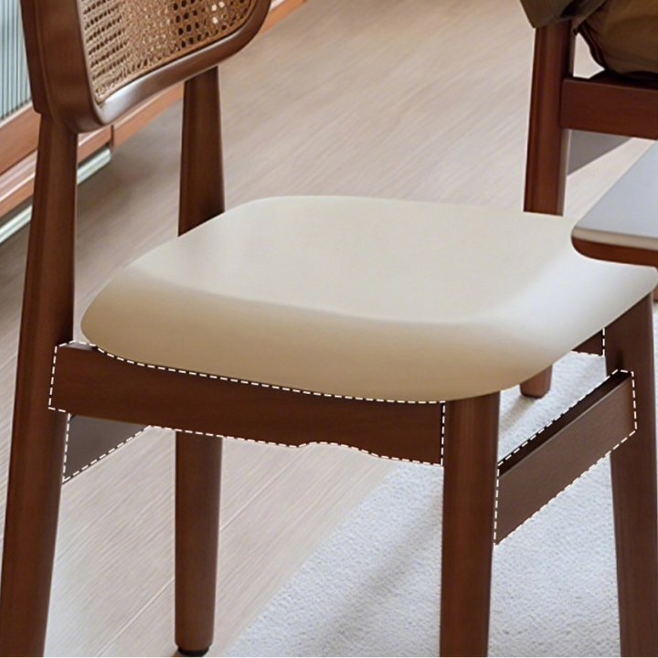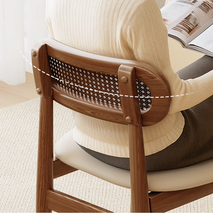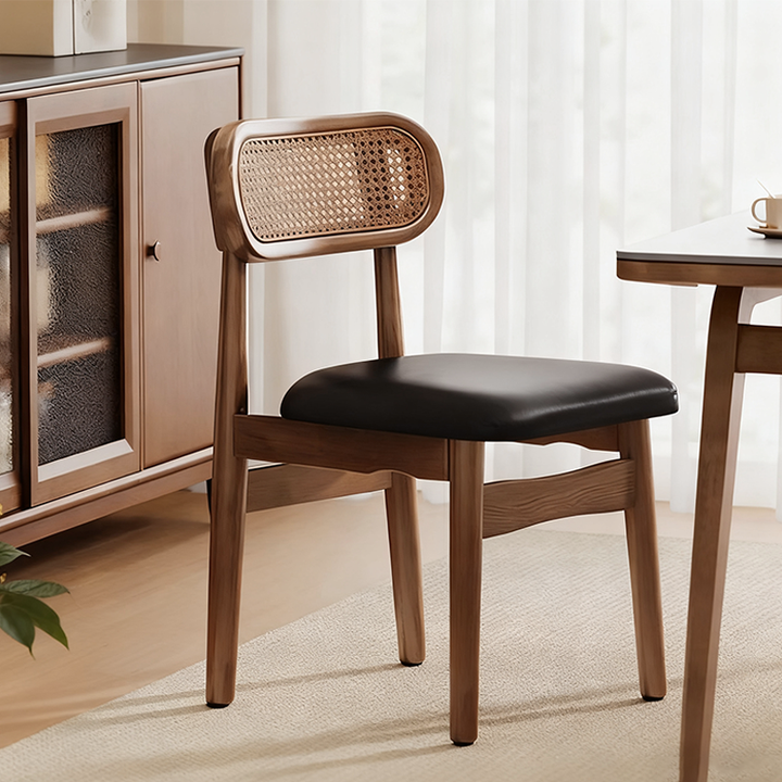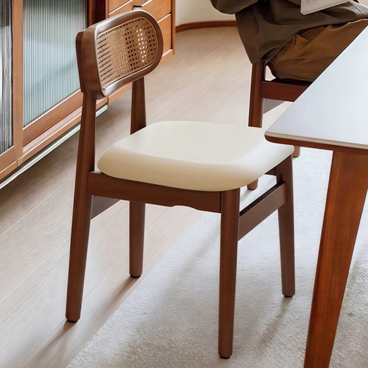 This solid wood rattan-back dining chair exudes elegant sophistication through its minimalist, natural design. Crafted from sturdy, durable rubberwood, its woven rattan backrest offers breathable comfort. Paired with a plush cushion, it ensures relaxed seating even during extended periods. With its sleek lines and versatile style, it adds warmth and style to any space—whether placed in a dining room, study, or coffee corner.