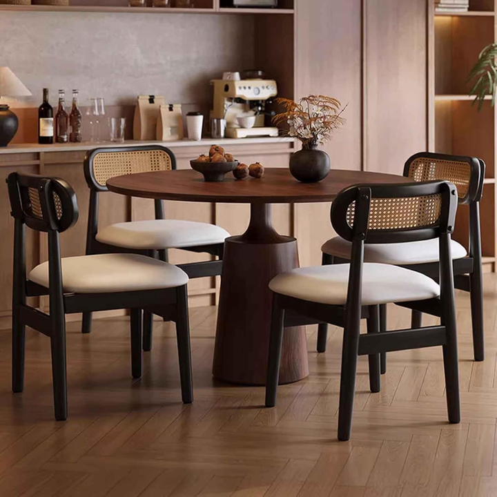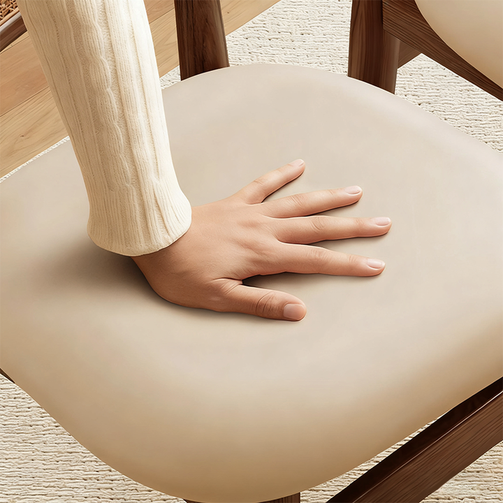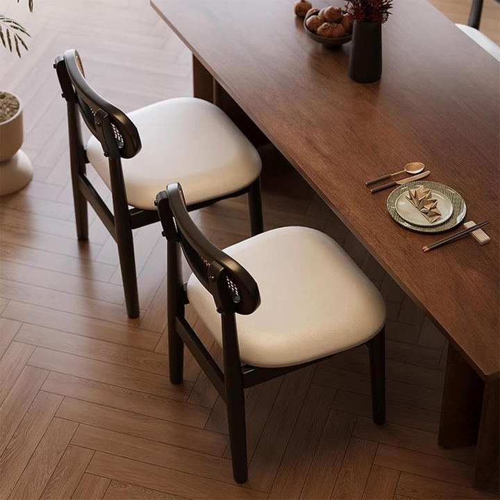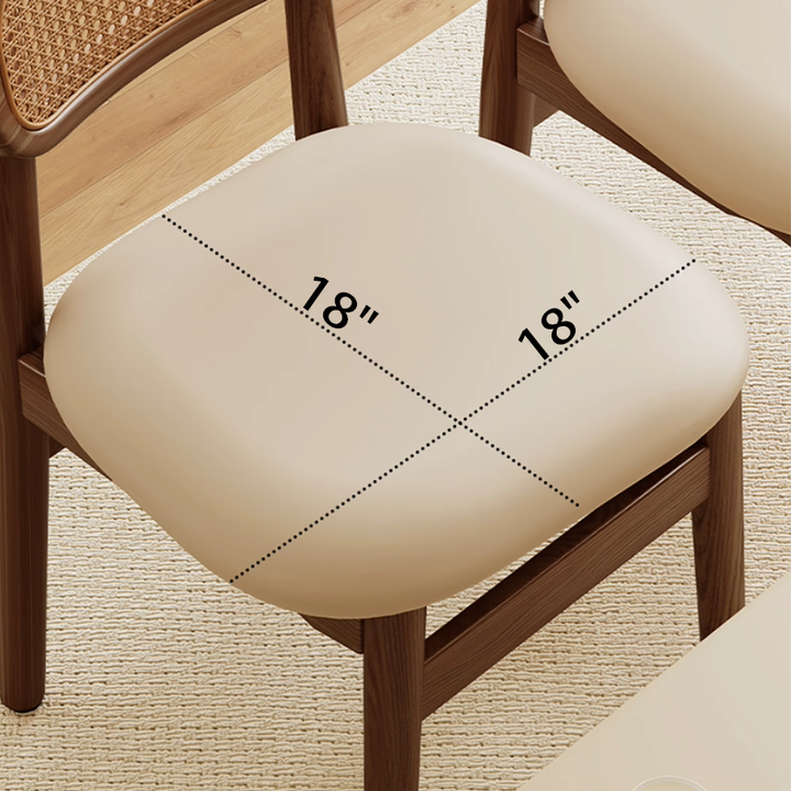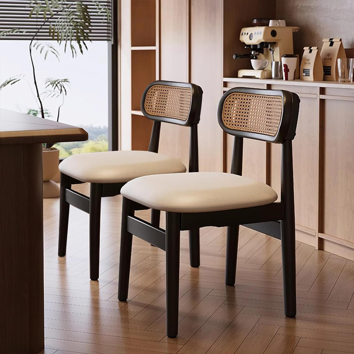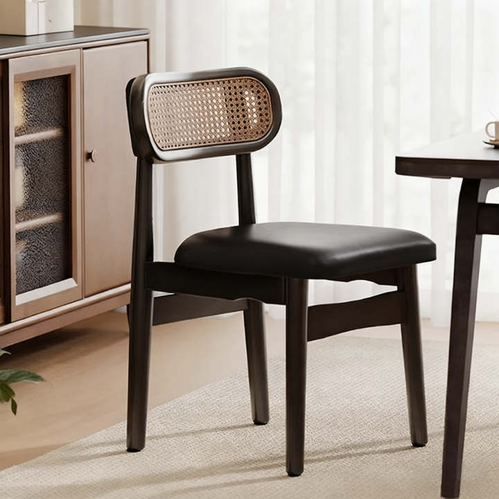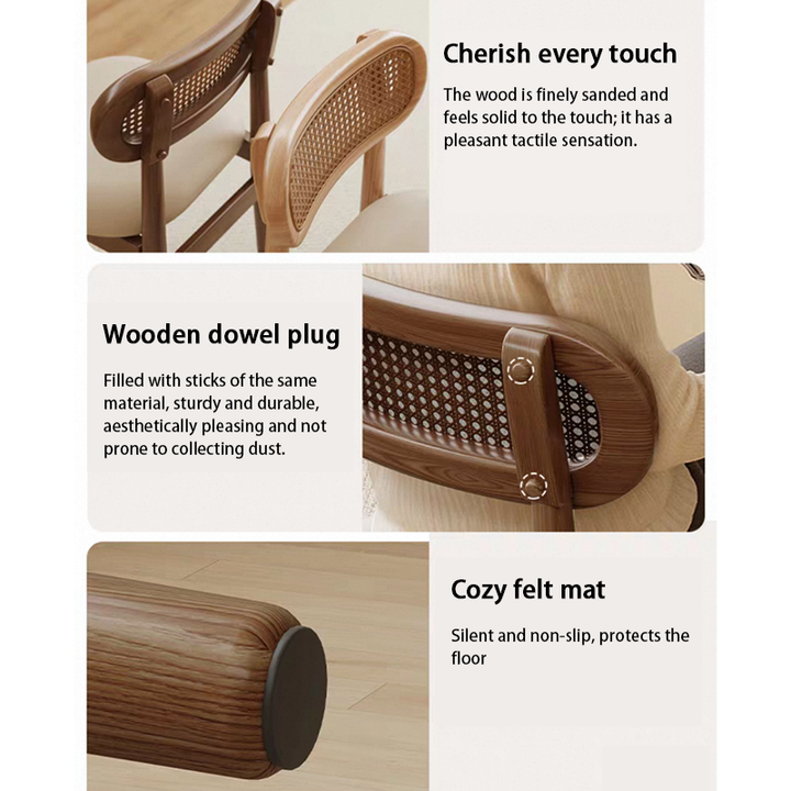 This solid wood rattan-back dining chair exudes elegant sophistication through its minimalist, natural design. Crafted from sturdy, durable rubberwood, its woven rattan backrest offers breathable comfort. Paired with a plush cushion, it ensures relaxed seating even during extended periods. With its sleek lines and versatile style, it adds warmth and style to any space—whether placed in a dining room, study, or coffee corner.