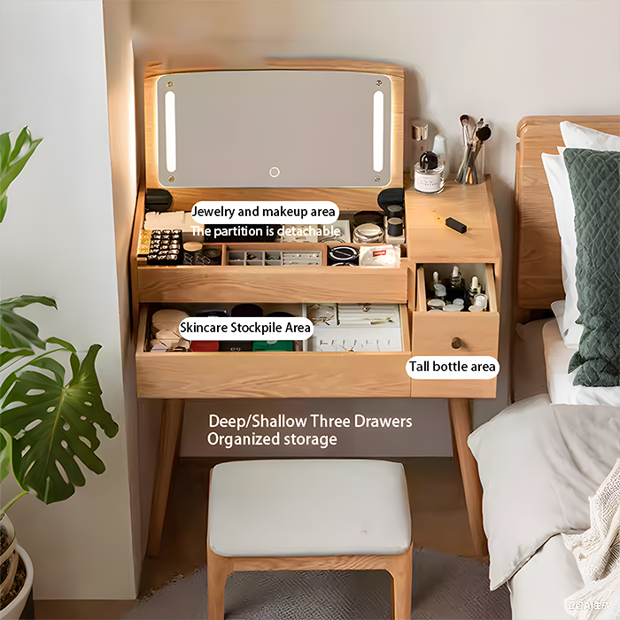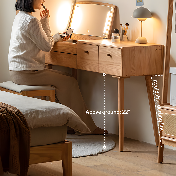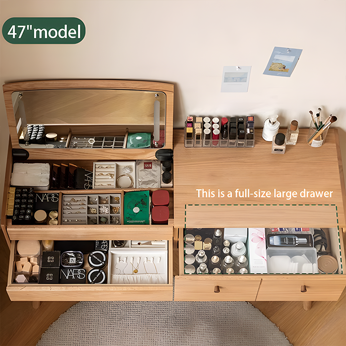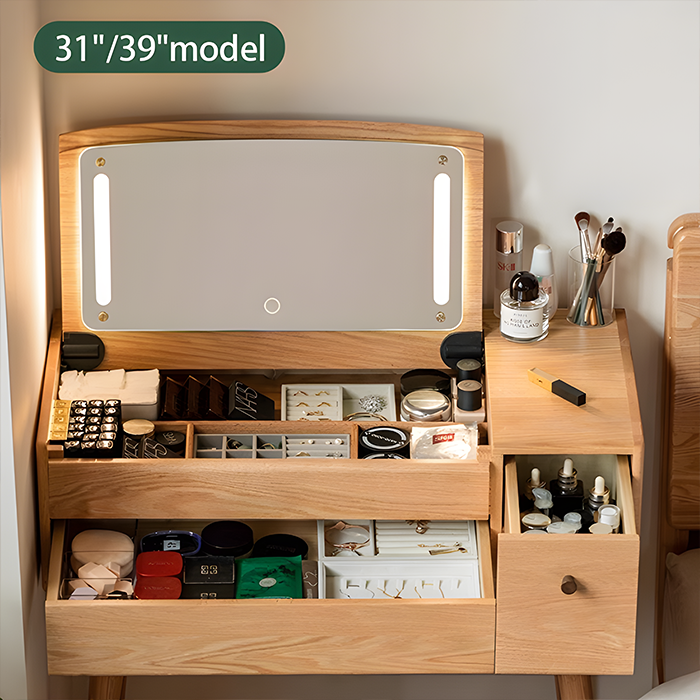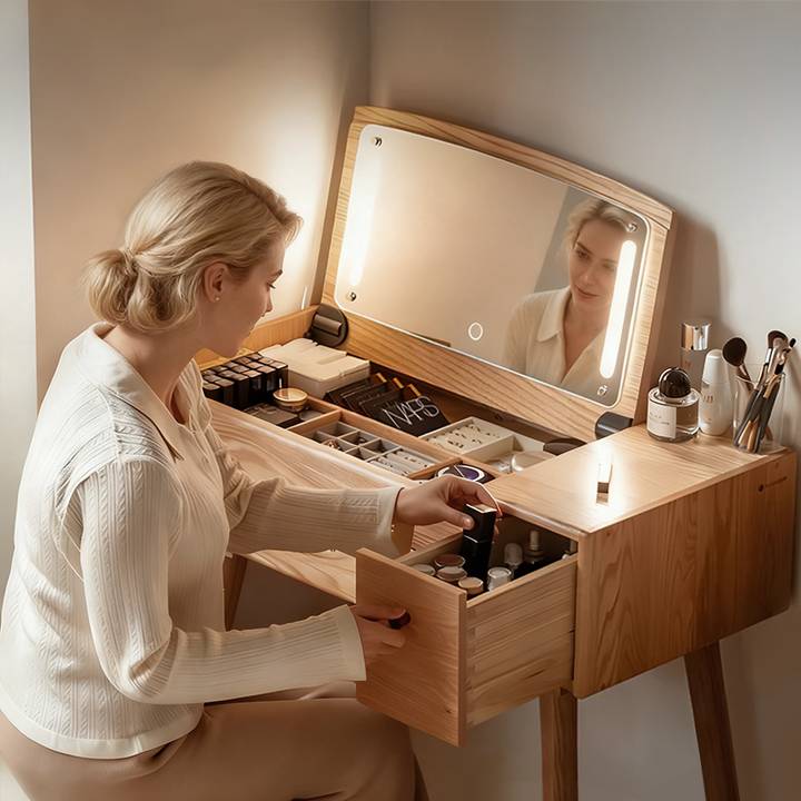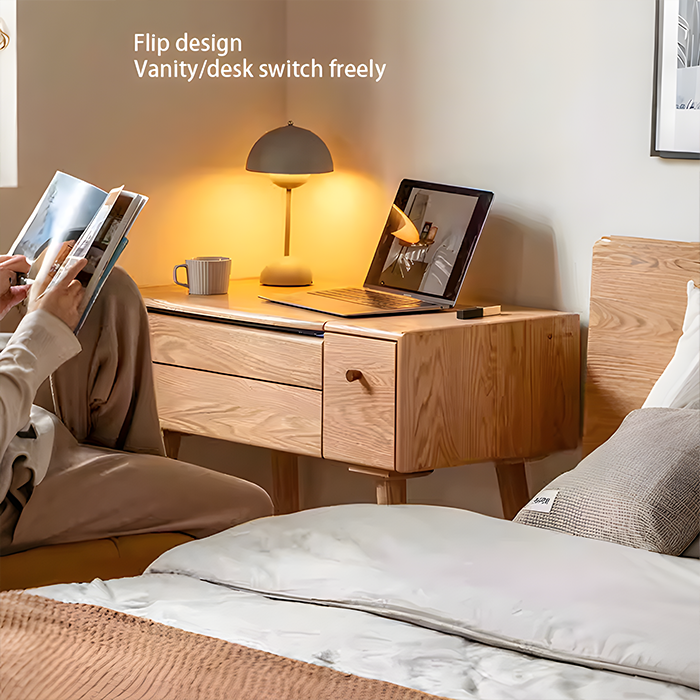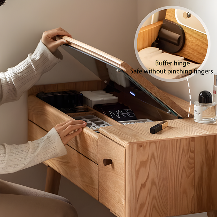 This solid wood dressing table features a warm, natural texture. Its flip-top mirror design allows flexible switching between dressing and desk functions. Ample storage space with multi-tiered drawers keeps everything neatly organized.