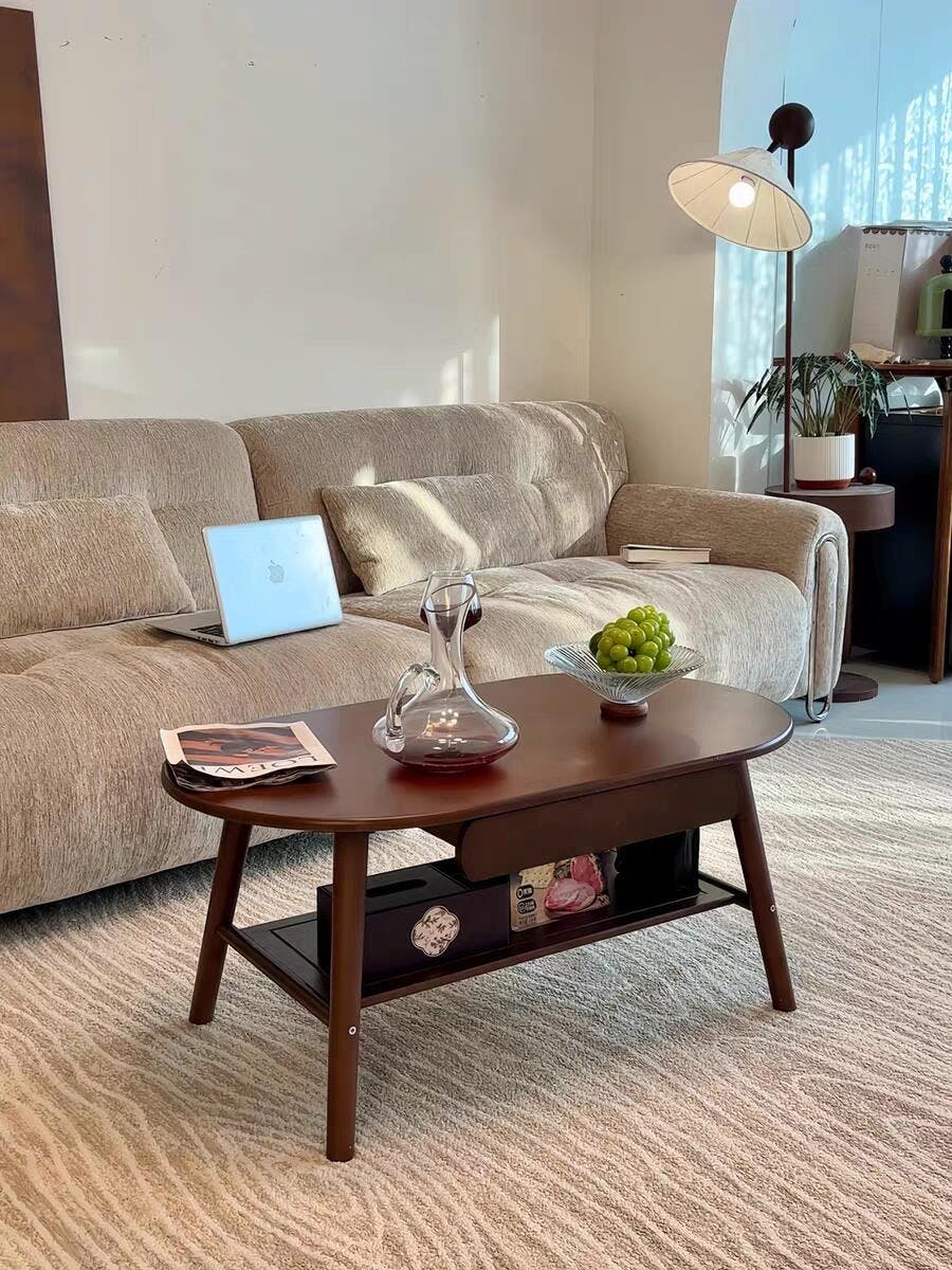 This solid wood oval coffee table features a warm, smooth texture with rounded corners for safety and aesthetics. Its double-layer design offers convenient storage. The minimalist silhouette complements diverse home styles effortlessly, adding a natural, cozy ambiance to your living room.