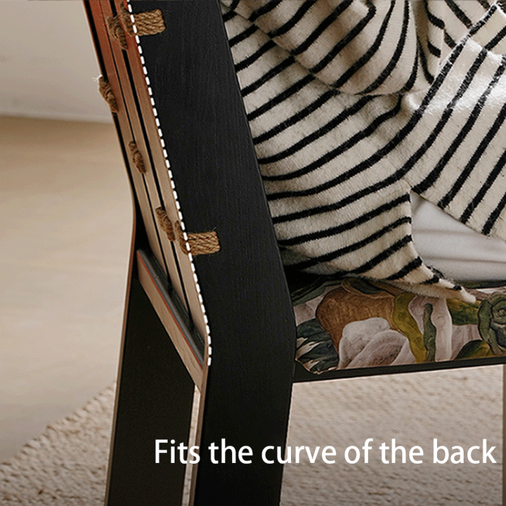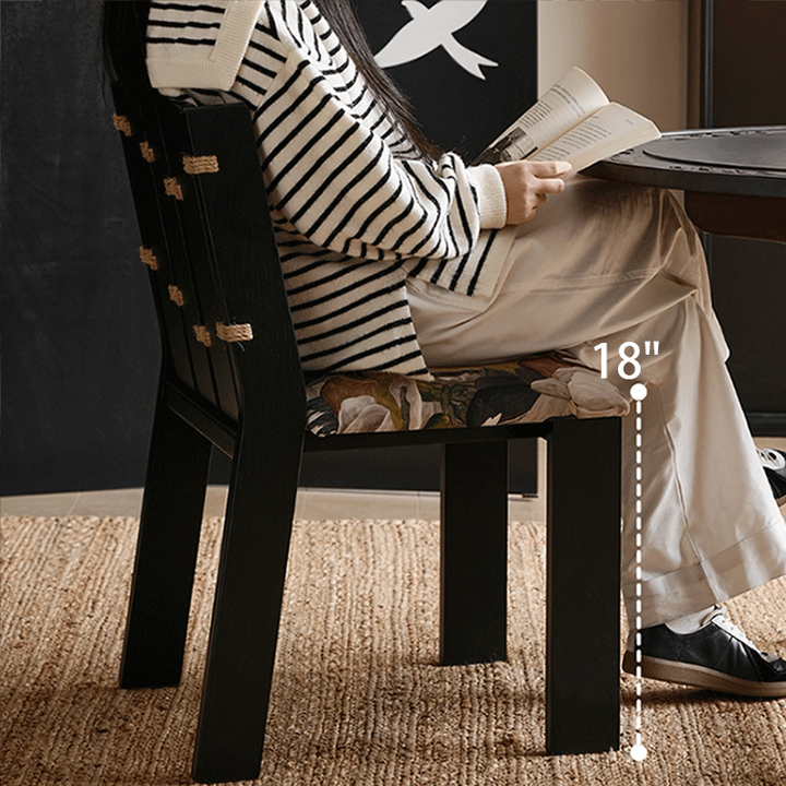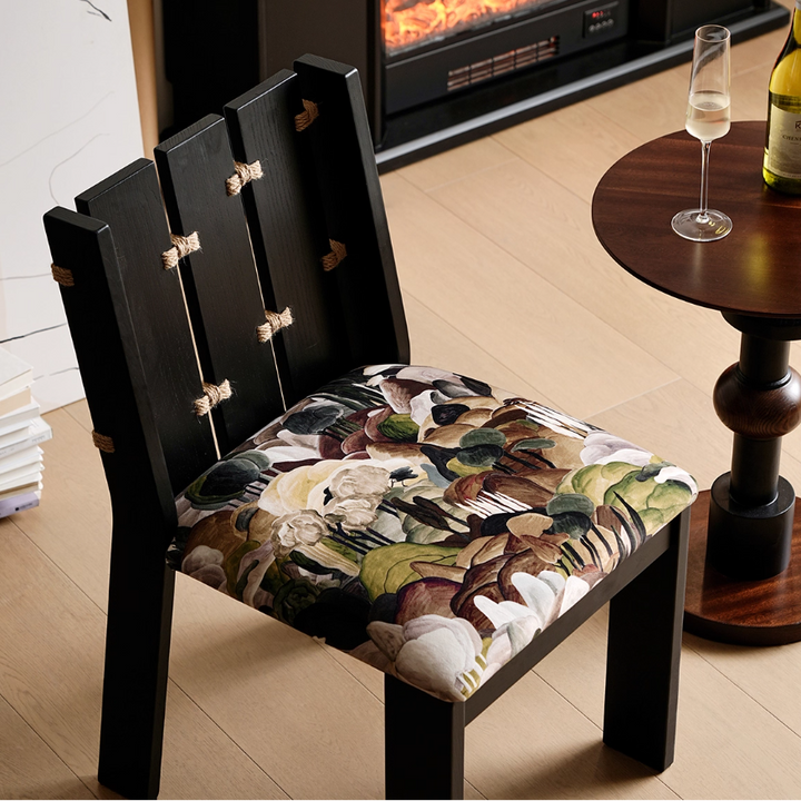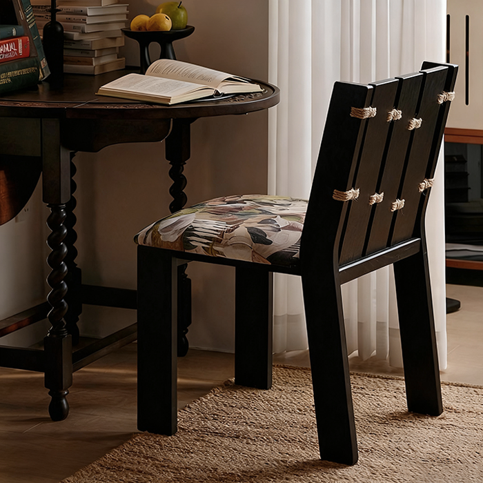 This solid wood rope knot chair combines a unique hemp rope joint structure with an elegant printed fabric seat, showcasing the beauty of nature and artistry. Its sturdy wooden frame and soft cushioning provide comfort, making it perfect for dining rooms, studies, or cozy corners to elevate any space.
