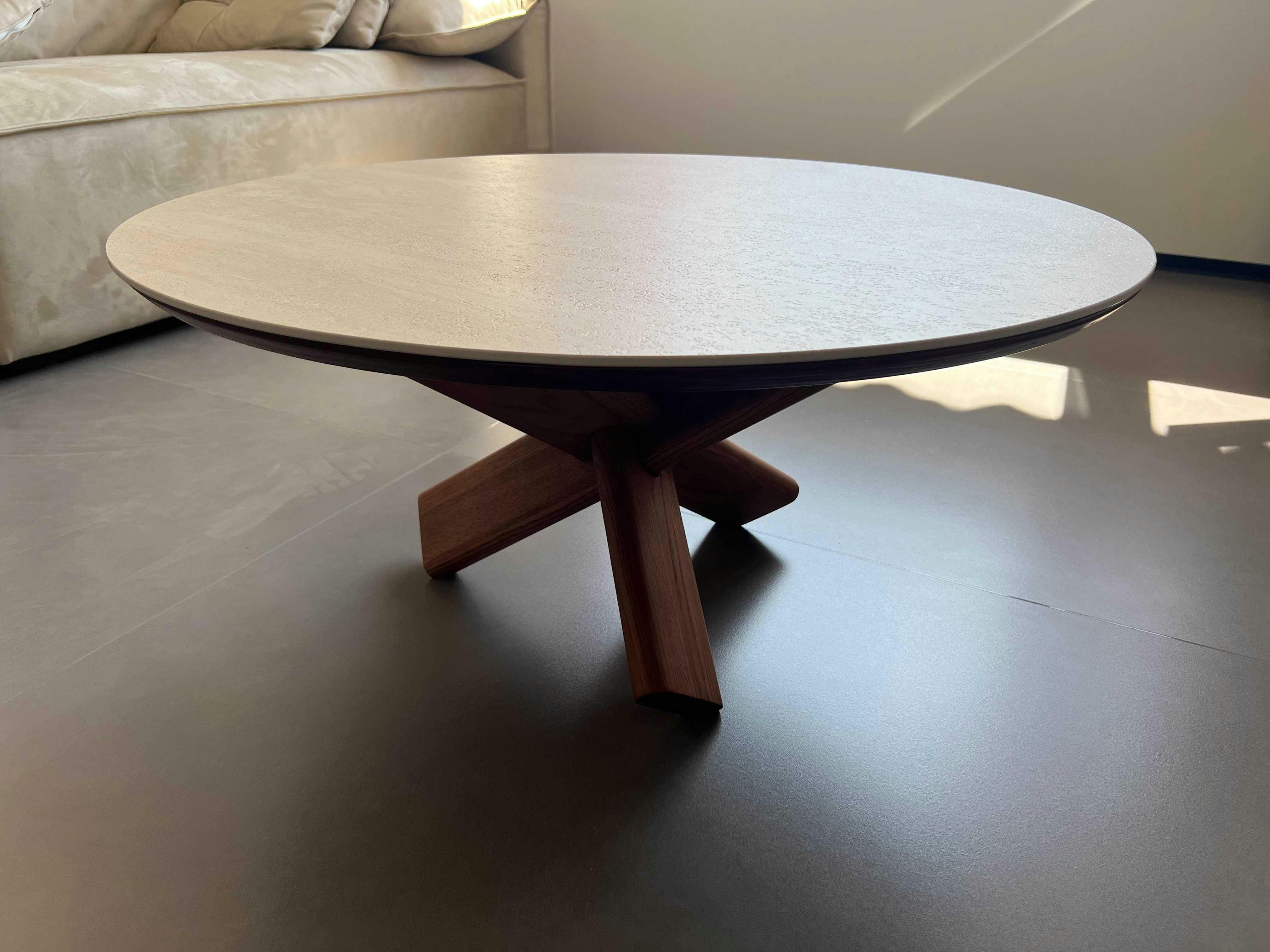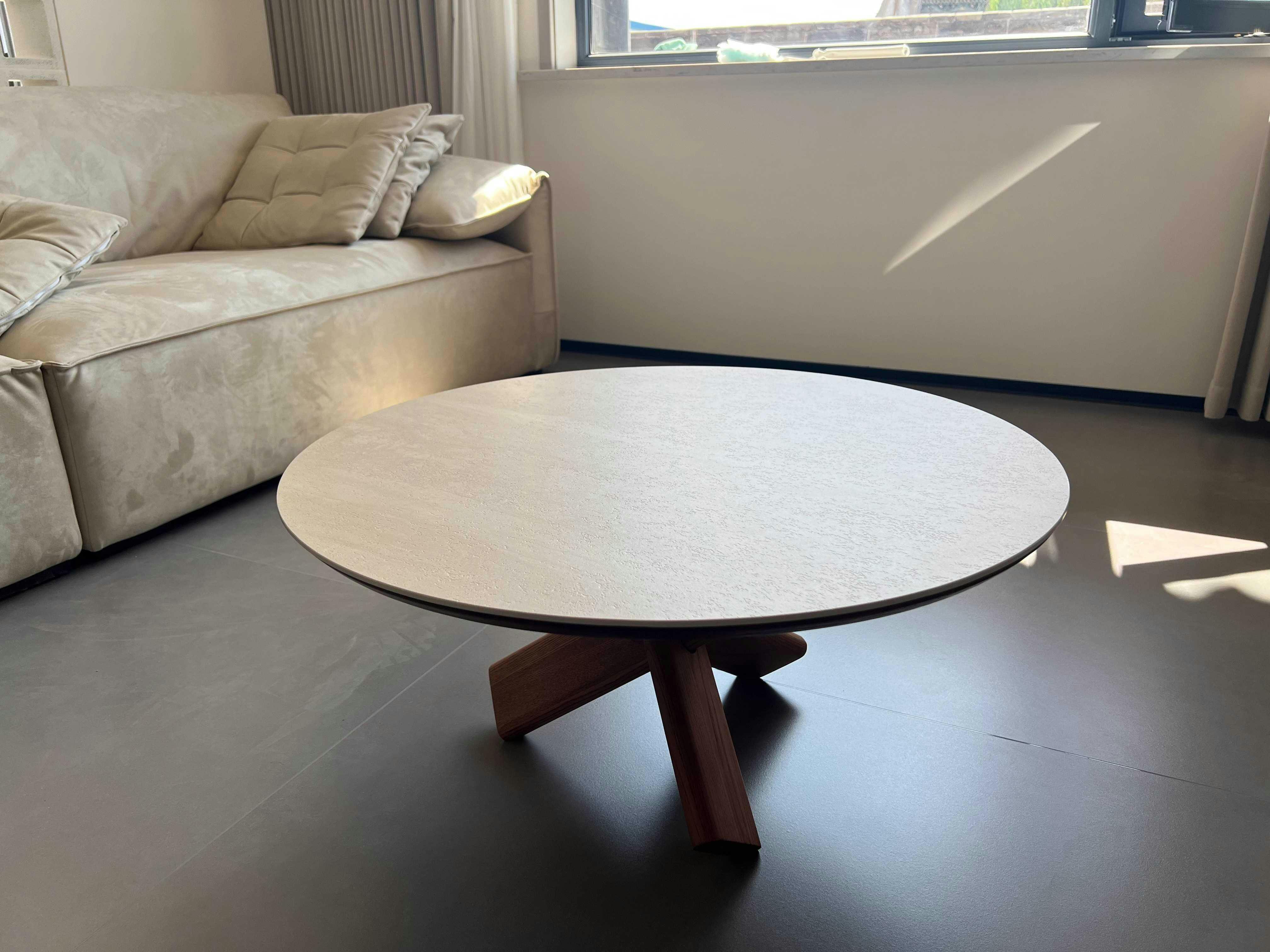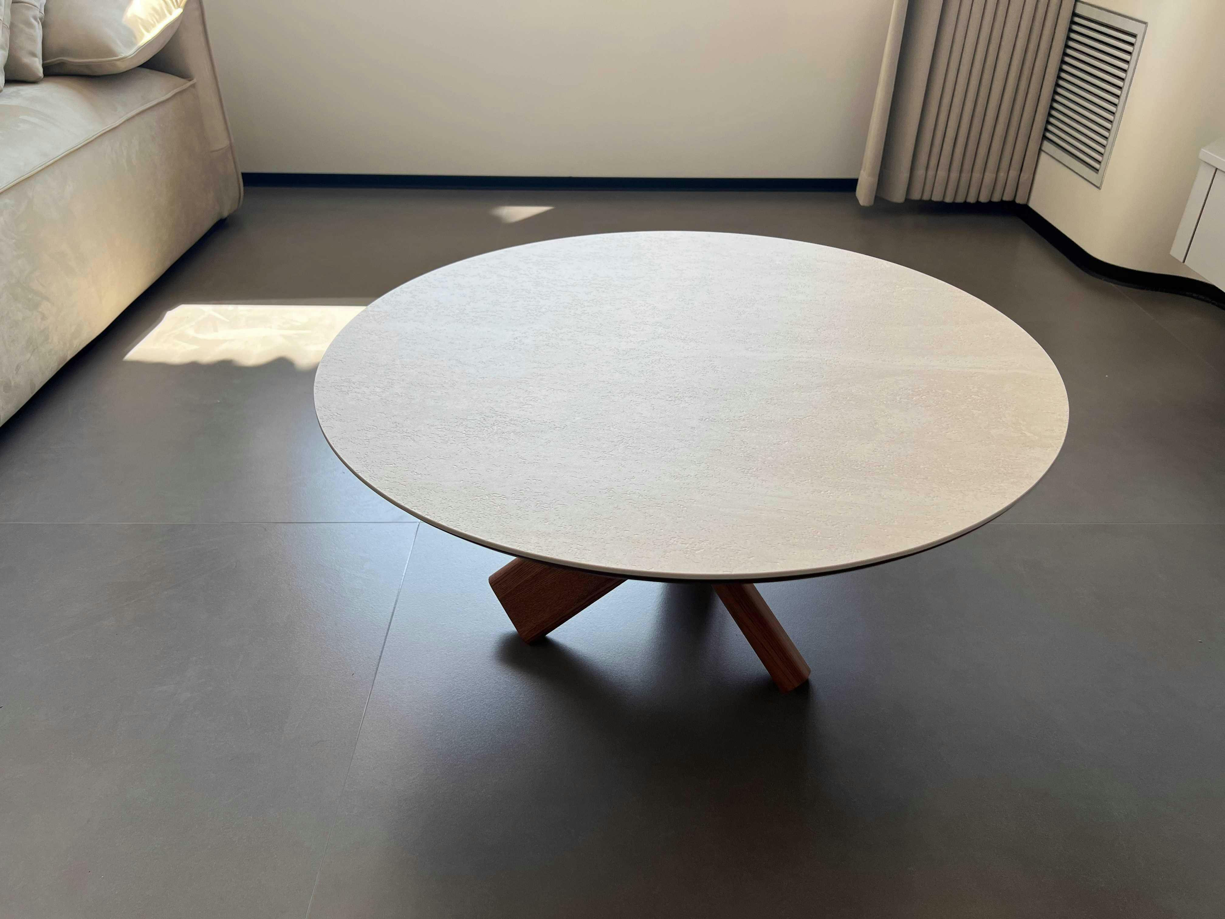 Solid Wood Round Coffee Table with Sintered Stone & Wood Top – Modern Scandinavian Style