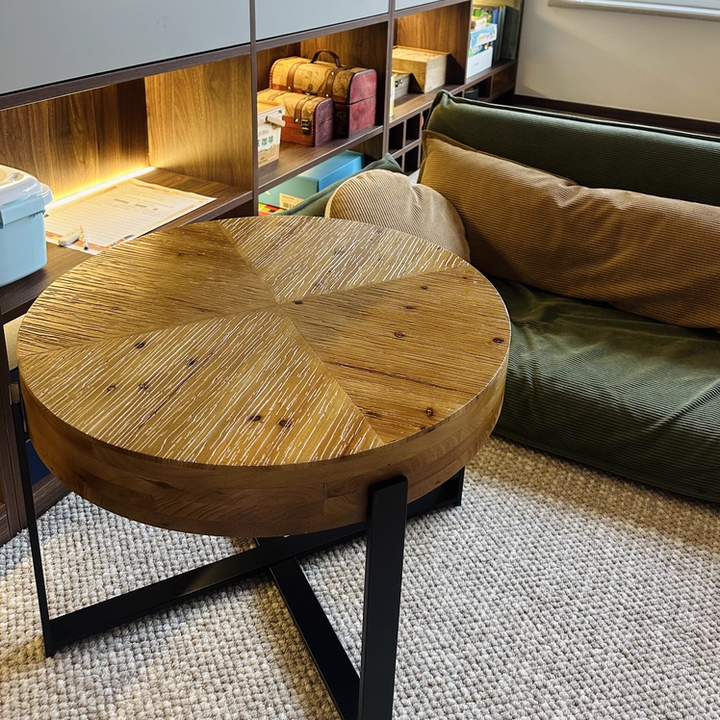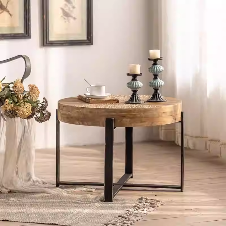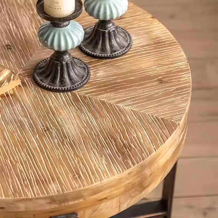 This solid wood round table features a vintage distressed finish, showcasing a unique natural aesthetic. Its compact design makes it perfect as a sofa side table or for living room balconies, serving both as a coffee table and creative decor. Crafted from sturdy solid wood with natural grain patterns, it offers a warm, organic feel that seamlessly blends into modern or vintage home styles—both practical and beautiful.