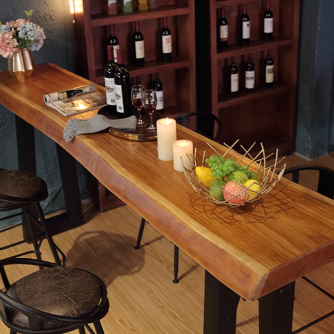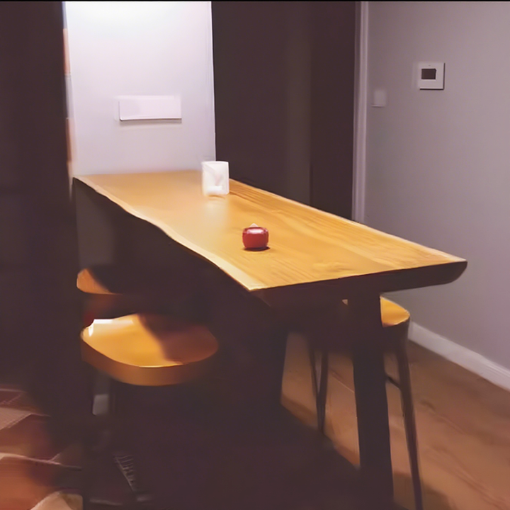 This solid wood wall-mounted bar table features a sleek, minimalist design crafted from solid timber for exceptional durability. Its narrow, elongated shape saves space, making it ideal for living rooms, dining areas, or as a room divider. Paired with bar stools, it offers both practicality and style, adding a natural, warm ambiance to your home.