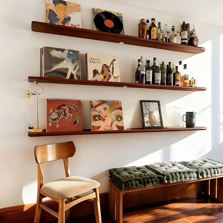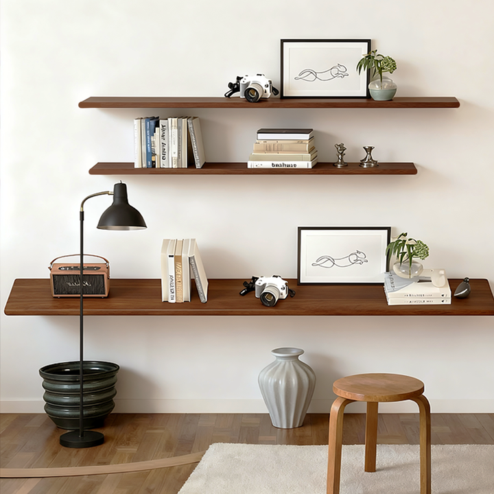 This solid wood wall shelf features a sleek, minimalist design that is both sturdy and durable. Perfect for living rooms, studies, dining areas, and more, it offers convenient storage and display solutions. Its smooth surface is easy to clean, combining practicality with aesthetic appeal.