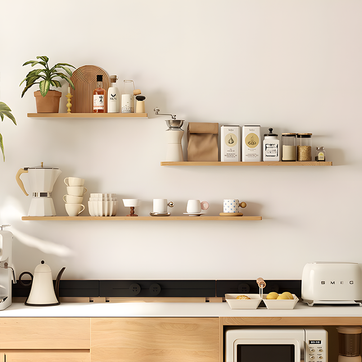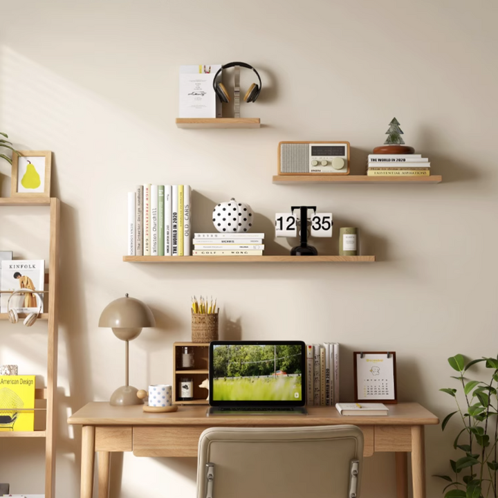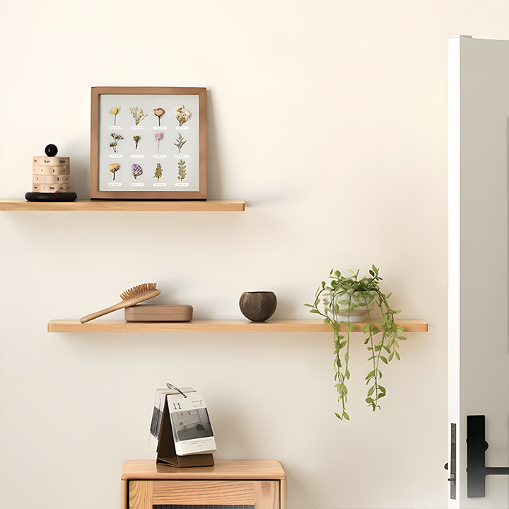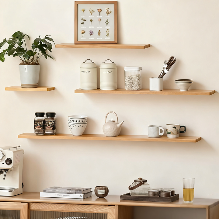 This solid wood wall shelving unit features clean lines and strong load-bearing capacity, securely holding books, decorative items, plants, and more. The warm, natural wood texture adds depth and aesthetic appeal to walls, blending practicality with beauty.