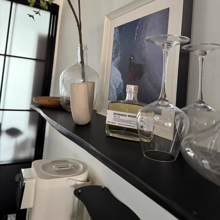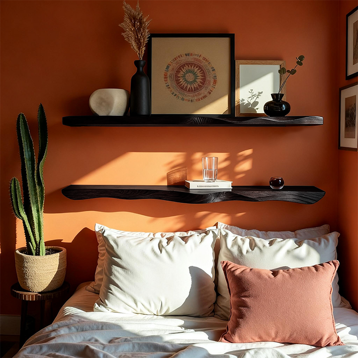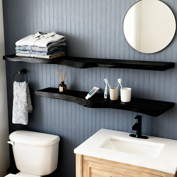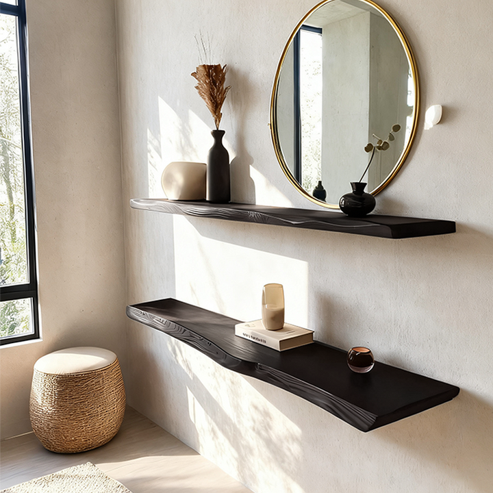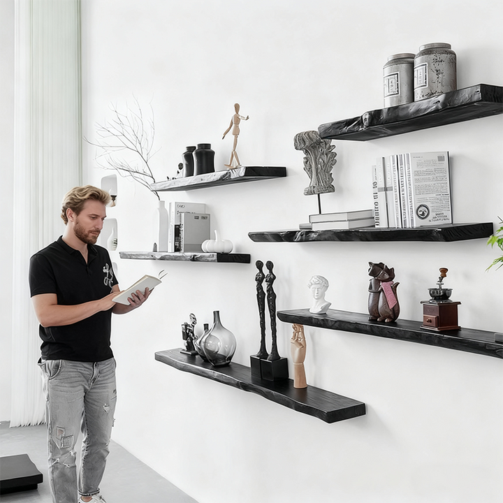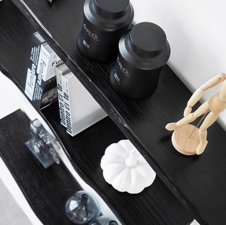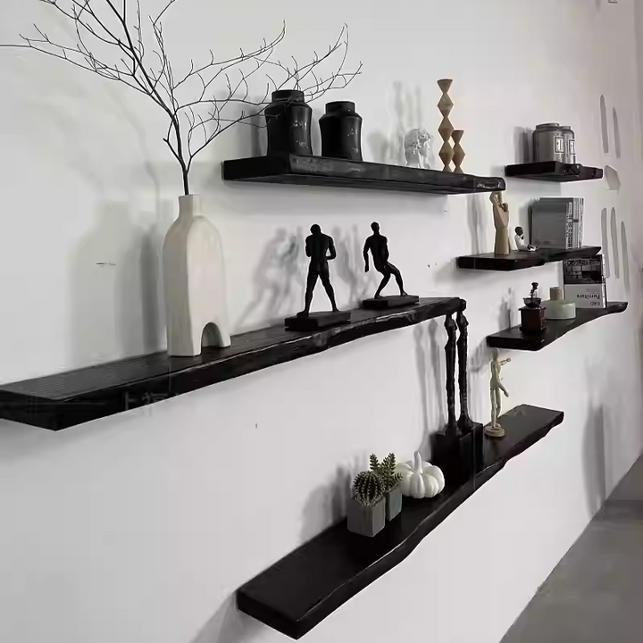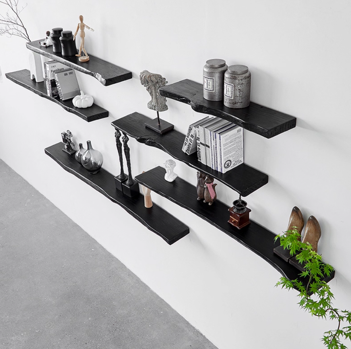 This wall-mounted shelving unit features a minimalist design and carbonized finish, offering sturdy durability for displaying books, accessories, beverages, or greenery. Its space-saving wall-mounted installation adds both functionality and aesthetic appeal to living rooms, bedrooms, studies, or dining areas.