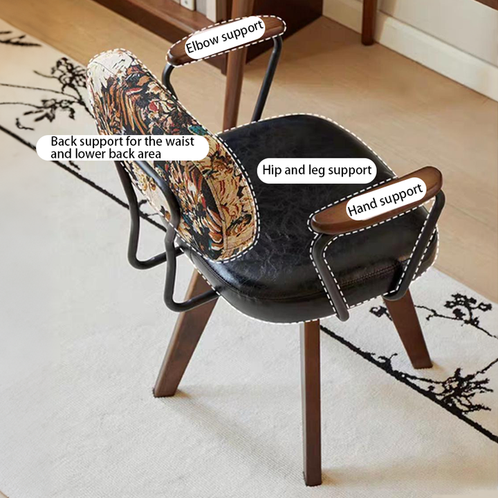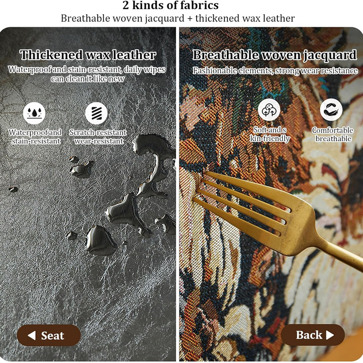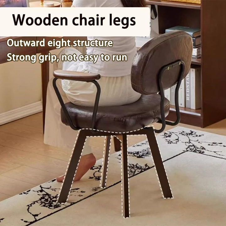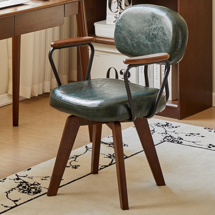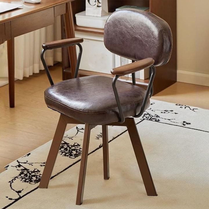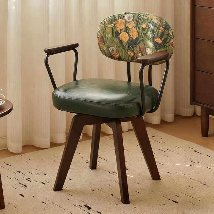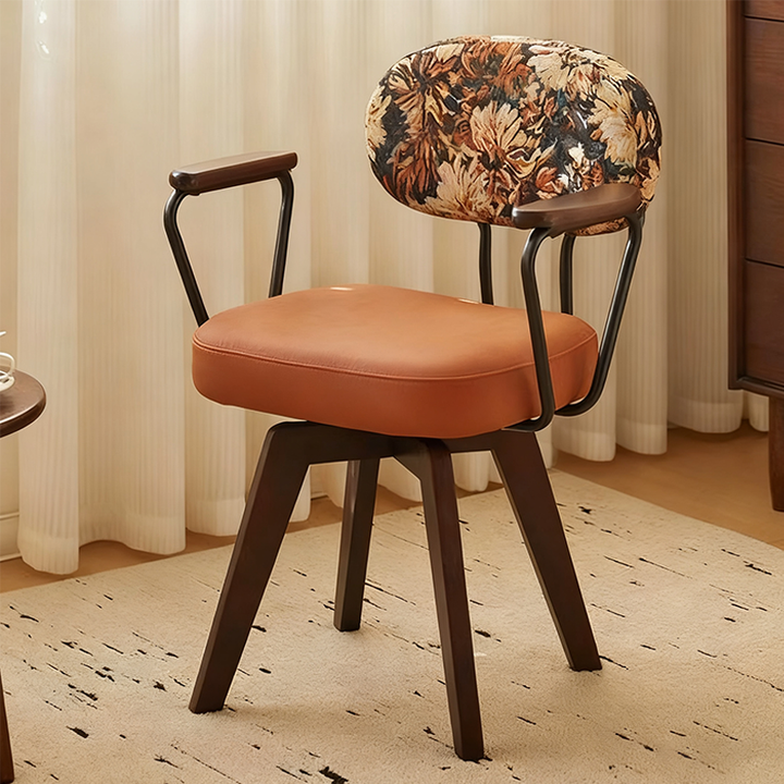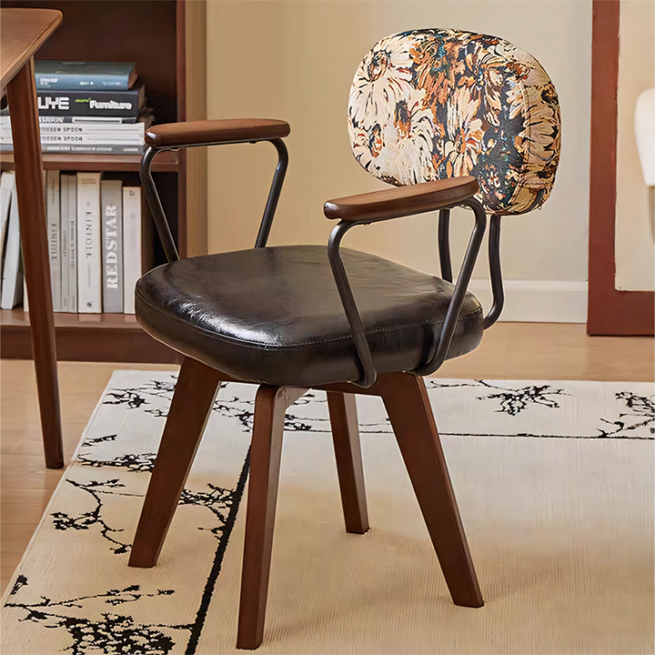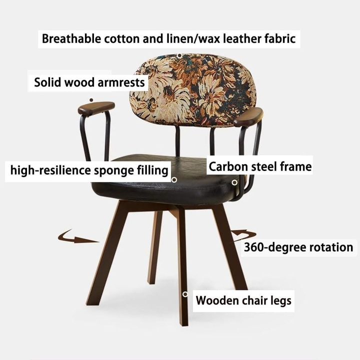 This vintage swivel chair combines aesthetics with comfort. The floral cotton-linen backrest offers breathable, skin-friendly support, while the oil-waxed leather seat cushion provides soft, resilient comfort. The carbon steel frame paired with solid wood legs ensures sturdiness and durability. Supporting 360° rotation, it suits dining rooms, home offices, cafes, and more, adding warmth and vintage charm to any space.