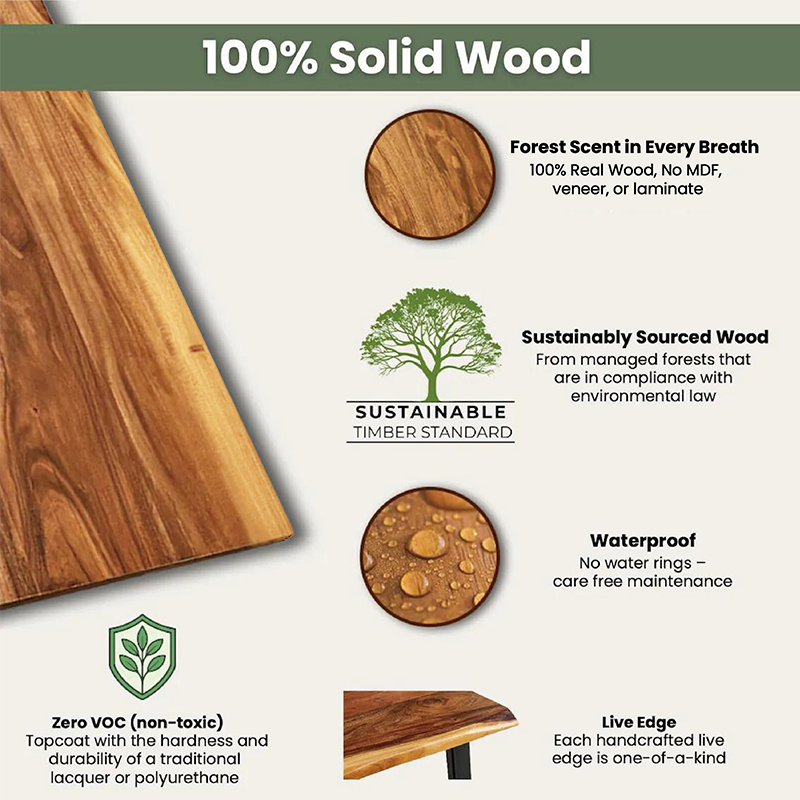 Our furniture is built using high-quality wood and finished with a durable protective coating to resist water, scratches, and heat. Each piece is treated with specialized techniques to ensure it stands up to everyday use, so you can enjoy it for years.