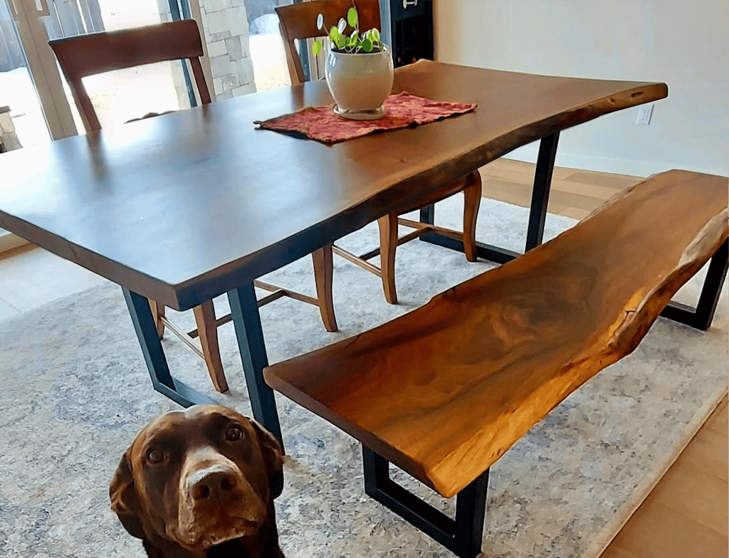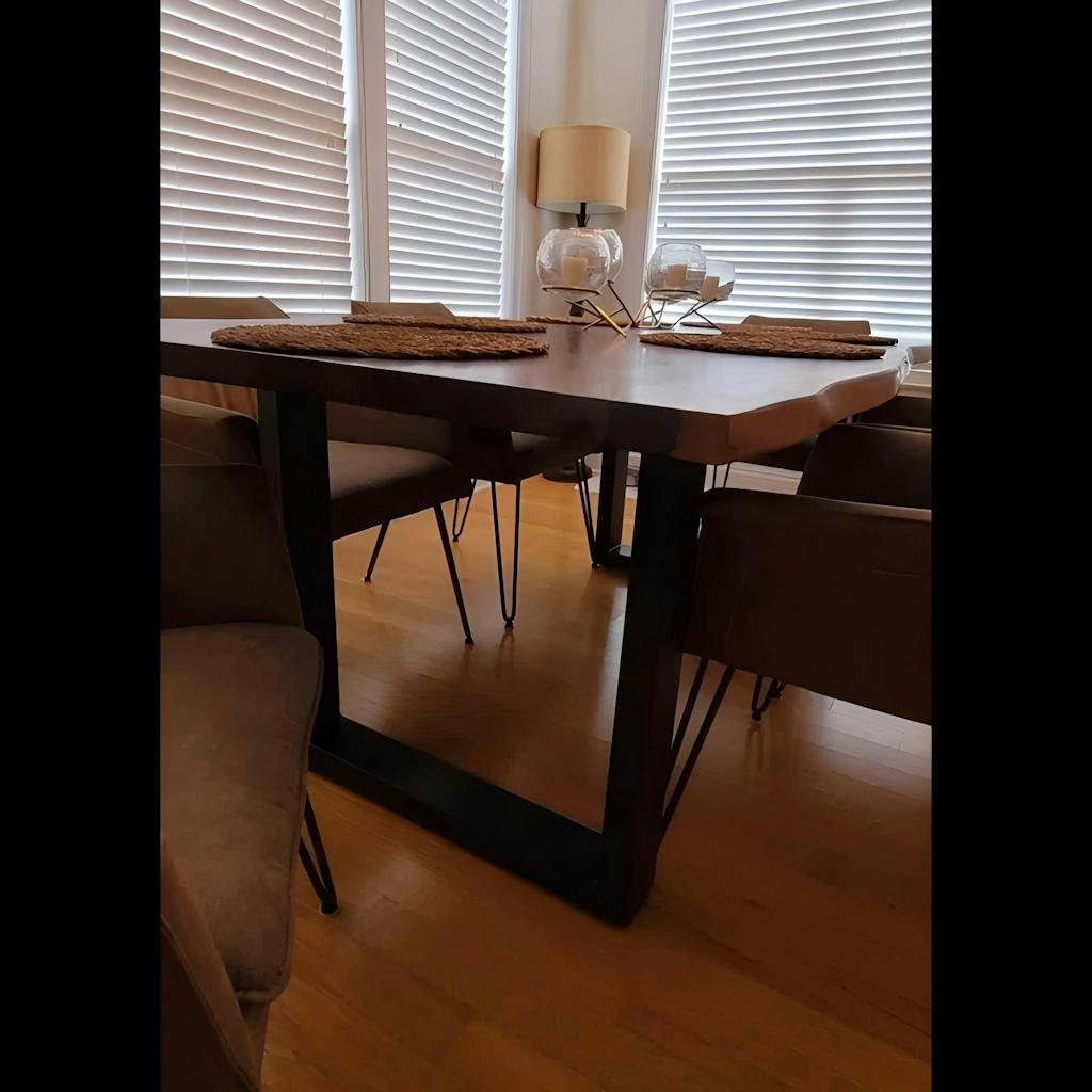 Natural wood mixed with metal can spice up any room. This solid wood table top has live edge detailing along its long sides to enhance its natural origins. Add the black metal U-shaped legs and you get a product that is both modern and timeless. Enjoy the flexibility to seat your family and friends comfortably for every occasion.