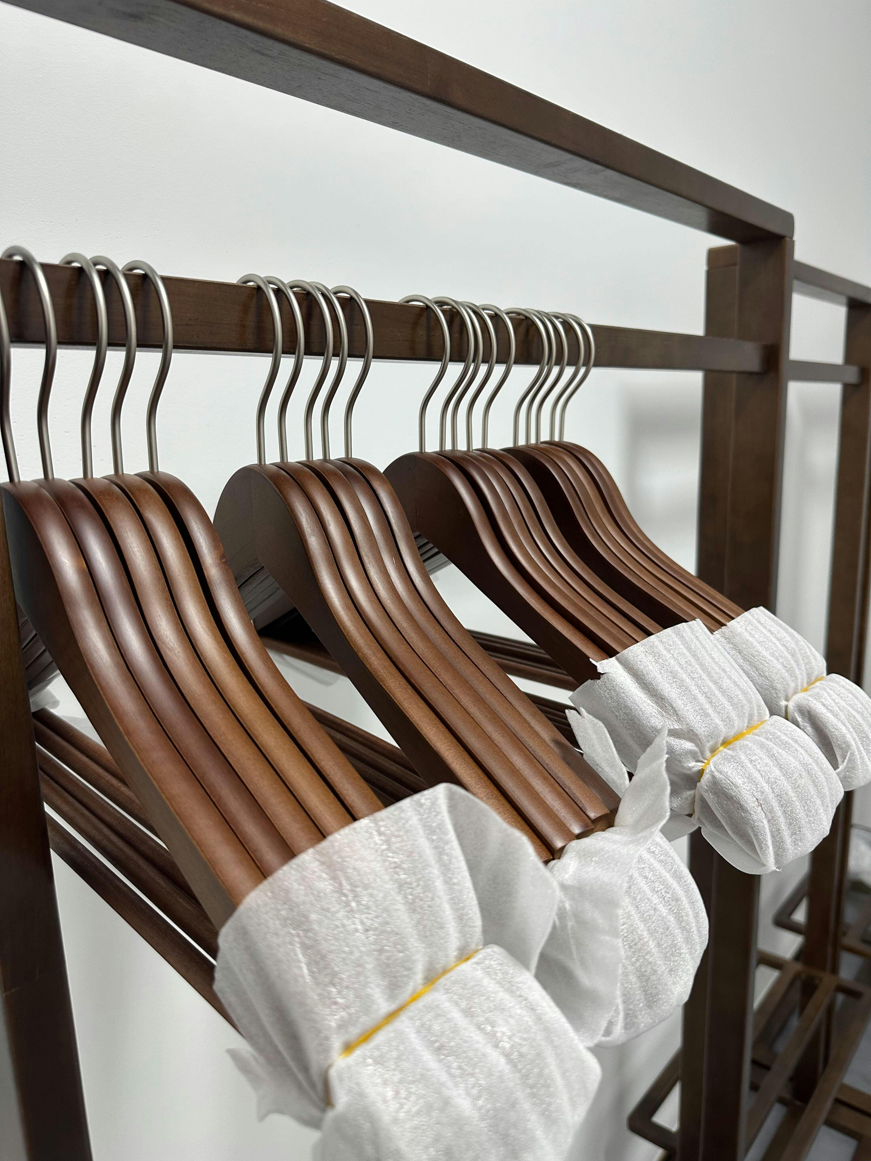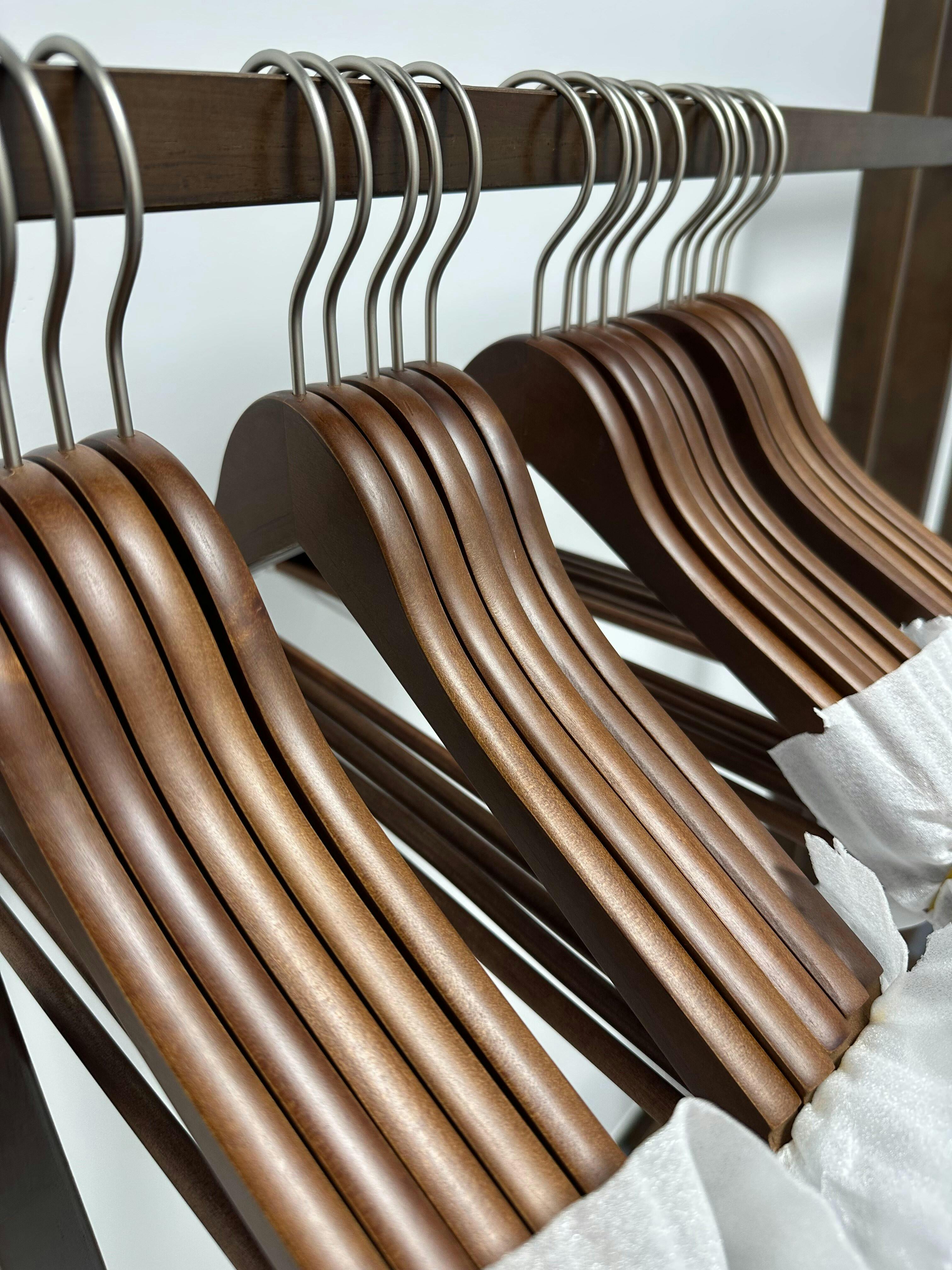 Crafted from solid wood with 360° rotating metal hooks for flexible use. Curved shoulders maintain garment shape and prevent distortion. Smoothly sanded surface protects fabrics while offering a sleek feel. A durable choice for organizing wardrobes, hanging coats, and knits, elevating storage quality.