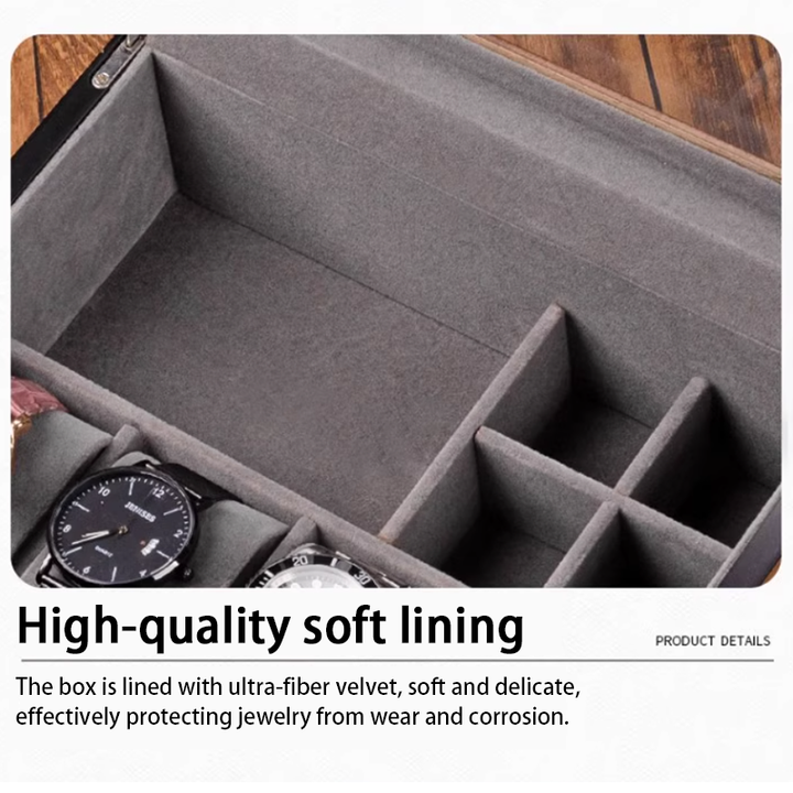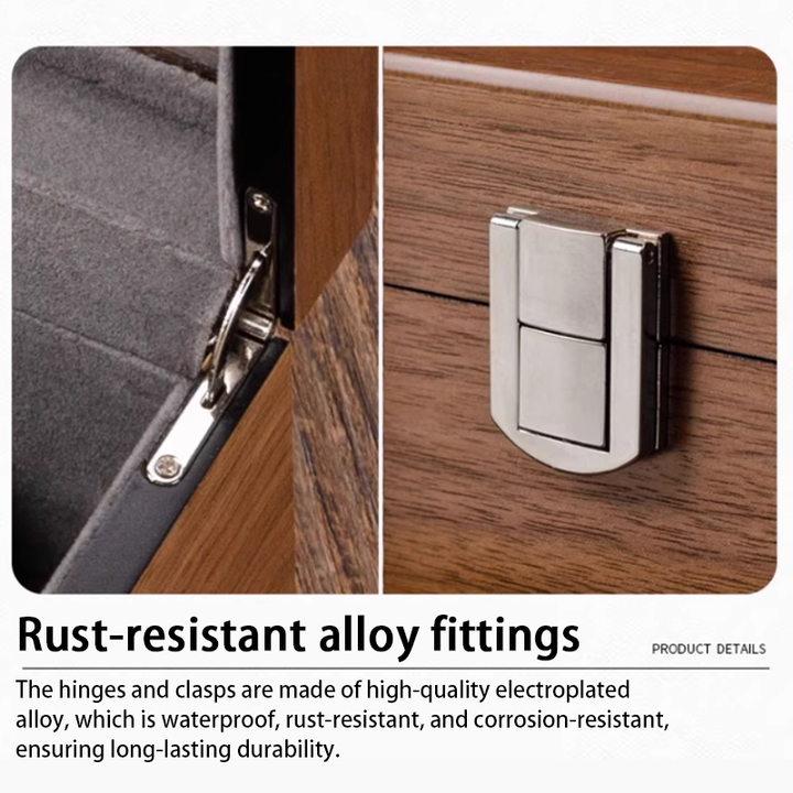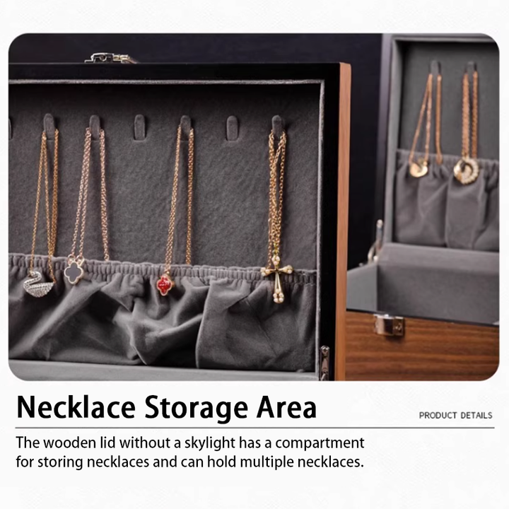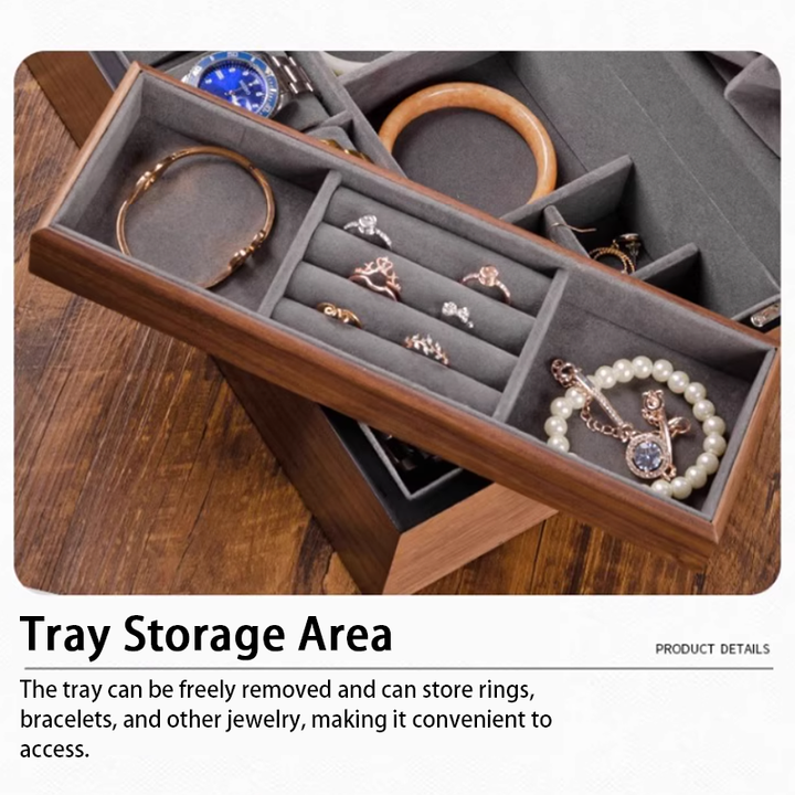 This wooden jewelry storage box features natural wood grain paired with a soft microfiber velvet lining, providing dedicated storage space for watches, rings, necklaces, and other accessories. Its compartmentalized layout with a dual-layer interior significantly increases storage capacity; items stay neatly organized, elevating daily tidiness with style and sophistication.