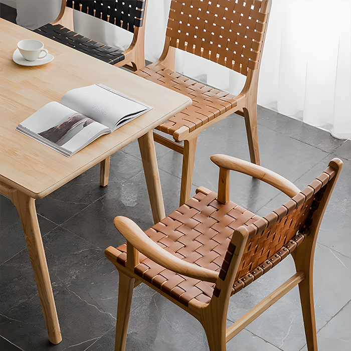 Handcrafted from solid wood with intricate handwoven rope detailing, it combines sculptural lines, lasting comfort, and Scandinavian–Mid-Century charm — perfect for dining rooms, studios, or cozy corners.